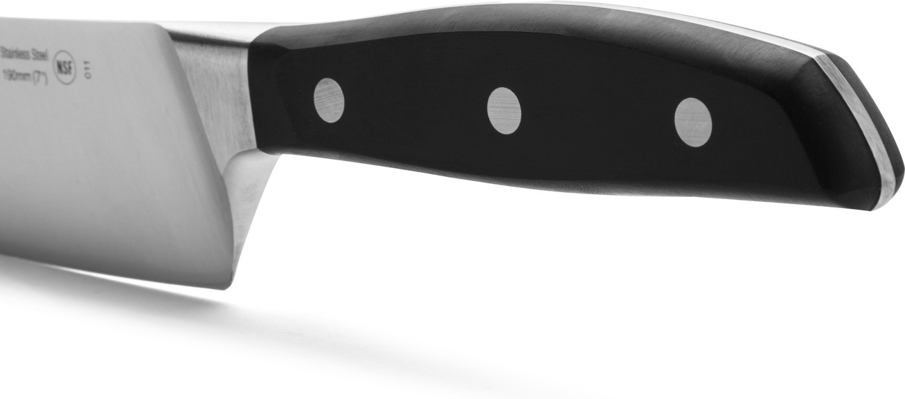 ARCOS Håndtaget på Manhattan-knivene er lavet af slidstærkt og fugtbestandigt polyoxymethylenplast (POM), og nitterne er lavet af rustfrit stål, der er modstandsdygtigt over for slitage. Håndtagene bliver støbt og sat på knivene på Arcos' egen fabrik. Håndtagene er særligt velformede og færdige for at give maksimal brugerkomfort.