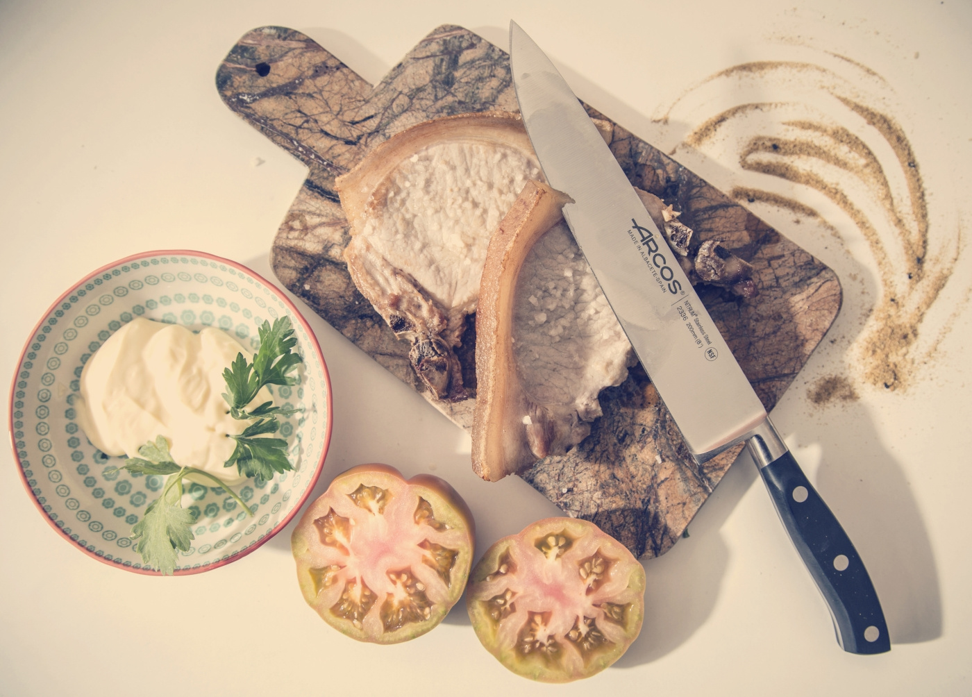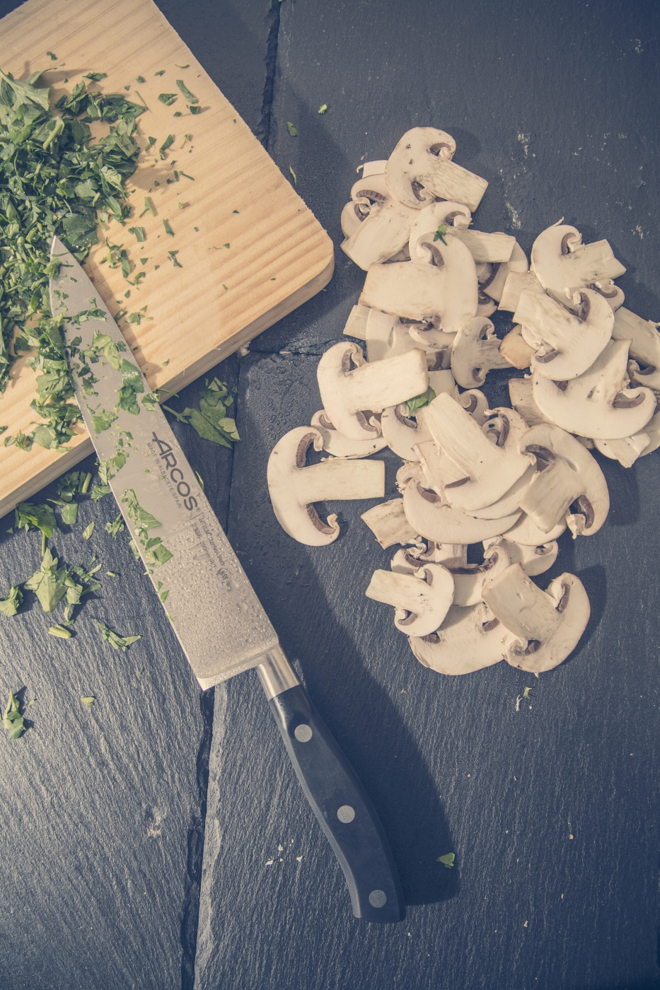 ARCOS knivene har et håndtag af slidstærkt, fugtbestandigt polyoxymethylenplast (POM) og nitter af rustfrit stål.ARCOS Håndtagene er støbt og sat på knivene på Arcos' egen fabrik. Knivene er pakket i stilfulde, gennemsigtige gaveæsker.