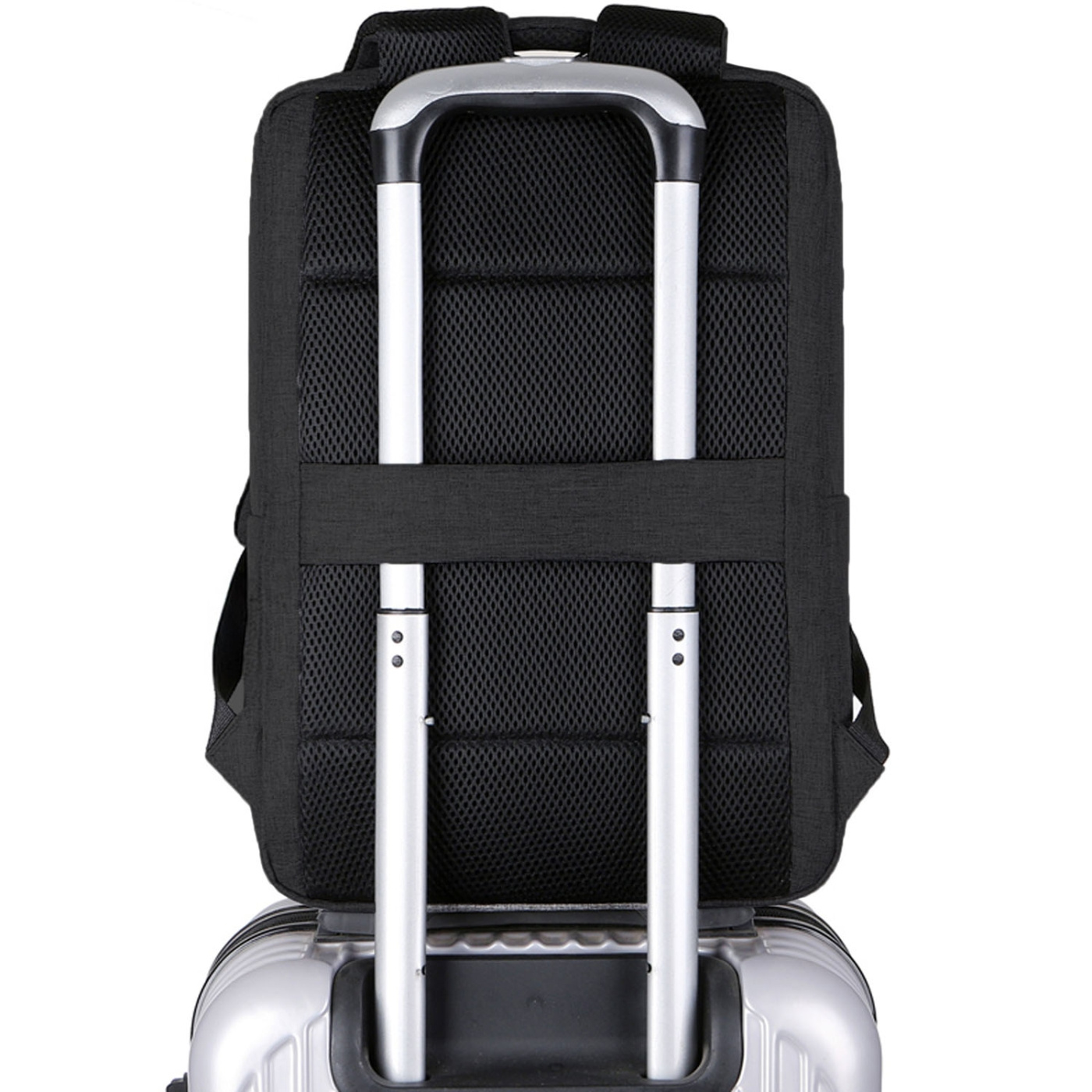 De vadderade axelremmarna ger hög komfort även vid längre användning, och den förstärkta bagageremmen på baksidan gör att ryggsäcken enkelt kan fästas på en resväska med hjul.