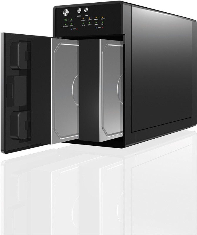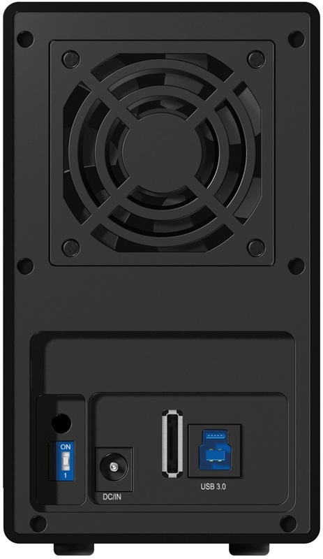 ekstern RAID-kabinet til to 3,5 " SATA-harddiske. På bagsiden finder du DIP-switchen som afgør om volumerne bliver RAID 0/1 eller JBOD . Tilsluttes med medfølgende USB 3.0 kabel eller SATA-kabel. Boksen er afkølet af en 60mm fan på bagsiden.