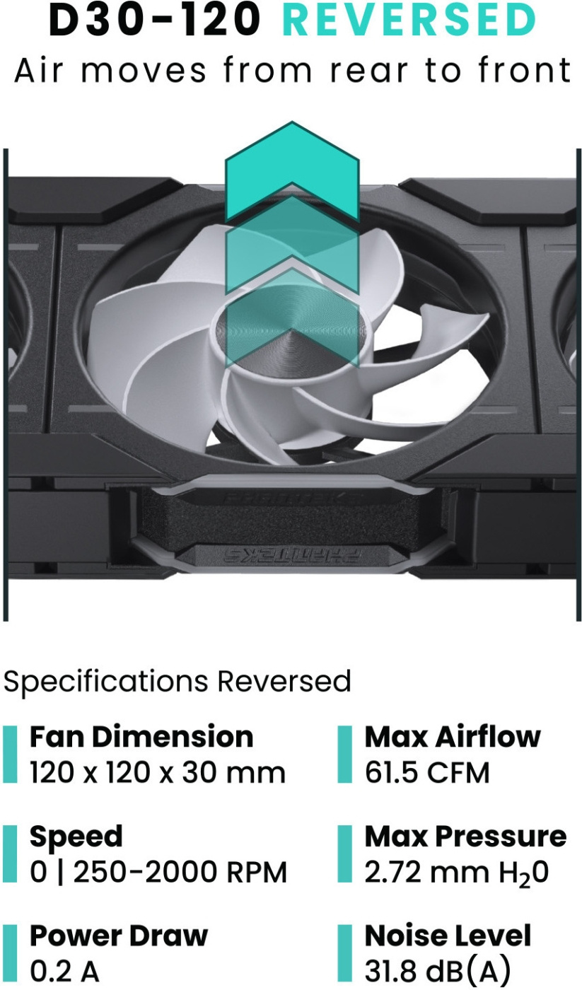 D30-120:kombinerer førsteklasses D-RGB-belysning med 30 mm tykke og aerodynamiske ventilatorvinger, der er inspireret af den effektive T30-ventilator, hvilket gør den til en ægte premium-klasse D-RGB-ventilator til moderne konfigurationer. D30-120 fås i to forskellige modeller med forskellige luftstrømningsretninger, standard og omvendt. Dette unikke valgmulighed gør det muligt at sammensætte den perfekte blæserkonfiguration til ethvert system.