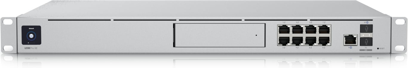 Ubiquiti UniFi Dream Machine Pro Special Edition er en alt-i-én-enhed til store og mellemstore virksomheder. Enheden kombinerer blandt andet en firewall, hurtig dual-WAN (10G SFP+ og 2,5GbE RJ45-porte), en administrerbar Gigabit PoE-switch, UniFi-controller og NVR med 128 GB integreret harddisk.