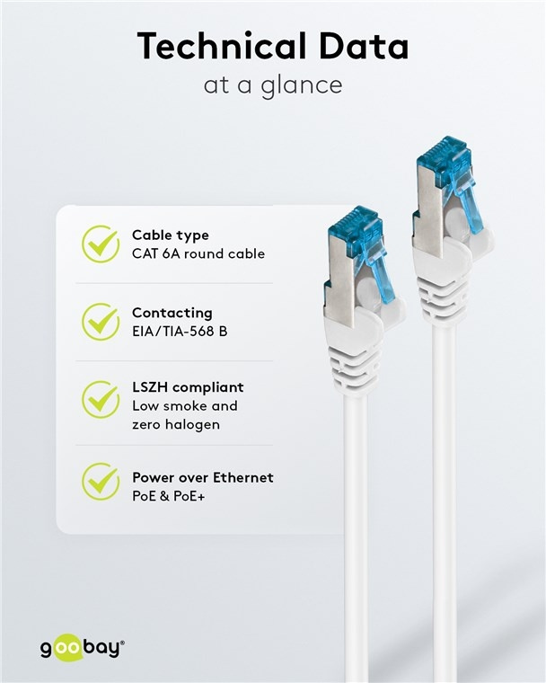 - Internetkablet er CAT-6A-testet (inkl. måleprotokol) og egnet til Power over Ethernet (PoE, PoE+).