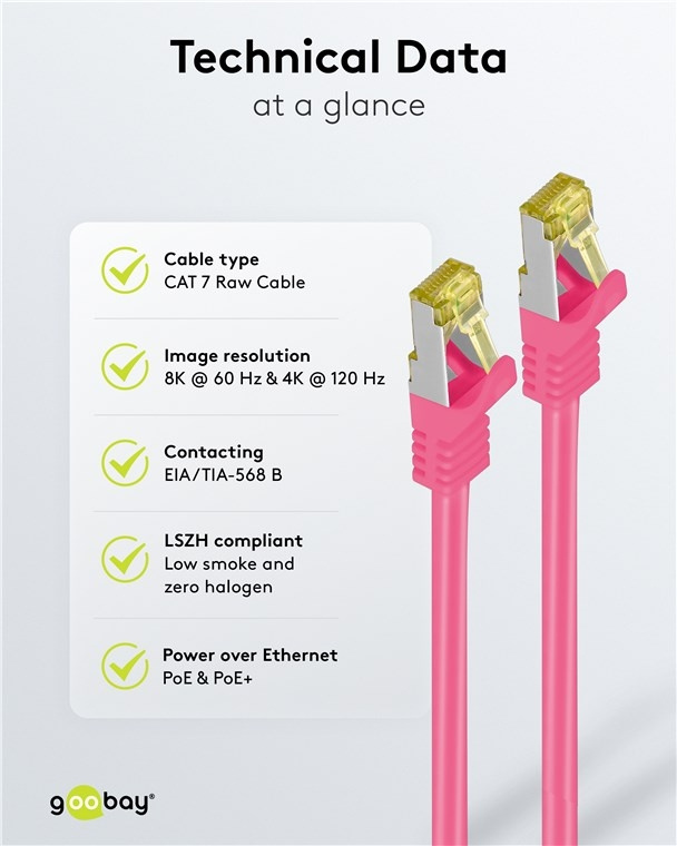 - CAT-7-kabel er egnet til Power over Ethernet (PoE, PoE+) og 10 Gigabit Ethernet med hastigheder på op til 10/100/1000/10000 Mbit/s