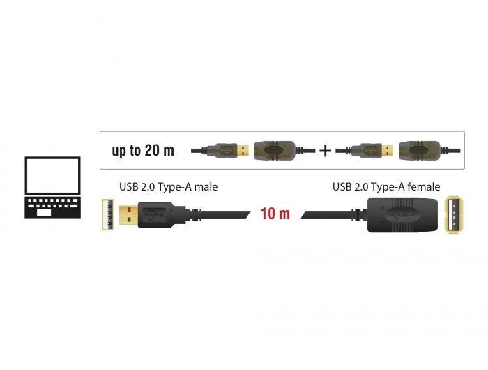 This USB 2.0 cable by Delock can be connected to an active USB port and enables an extension of 10 m. By connecting of an additional 10 m extension cable you can extend your USB port up to 20 m.