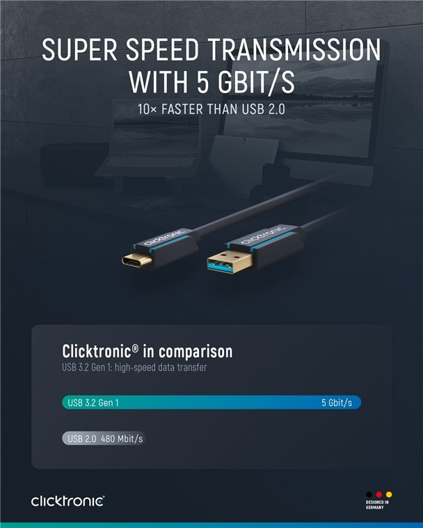 - USB-C™ kabel 3.2 Gen 1 med SuperSpeed dataoverførselshastighed på op til 5 Gbit/s er 10 gange hurtigere end USB 2.1.