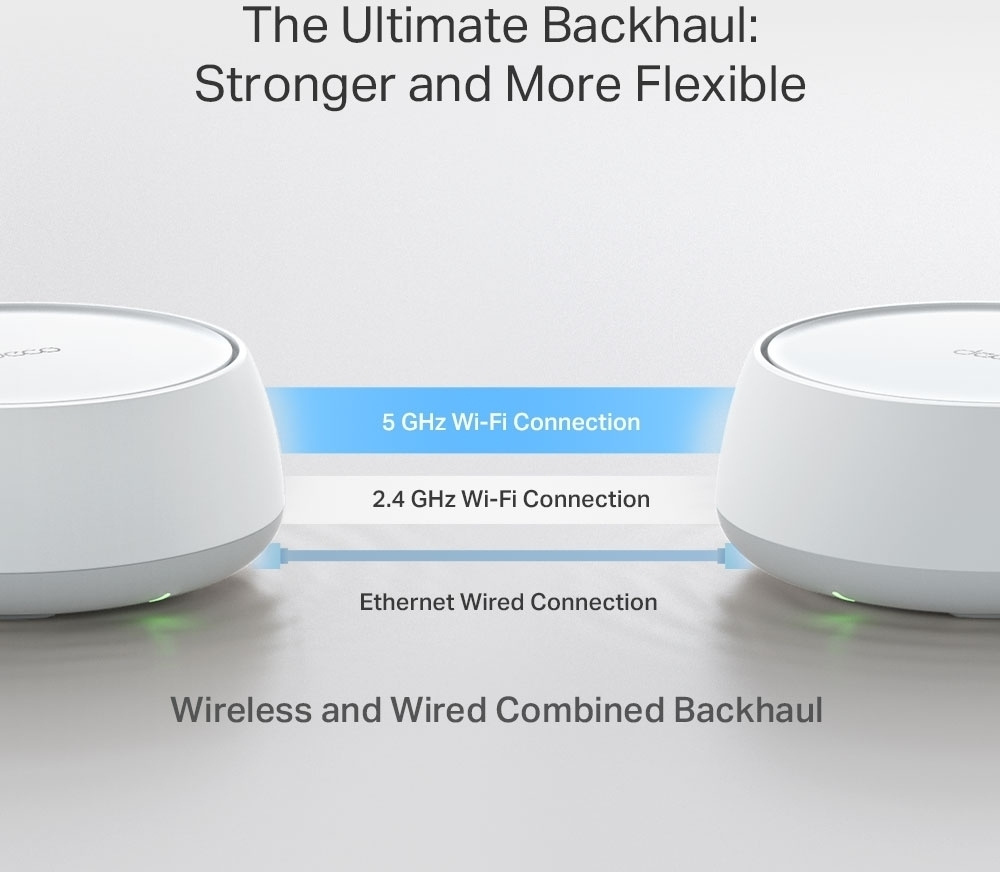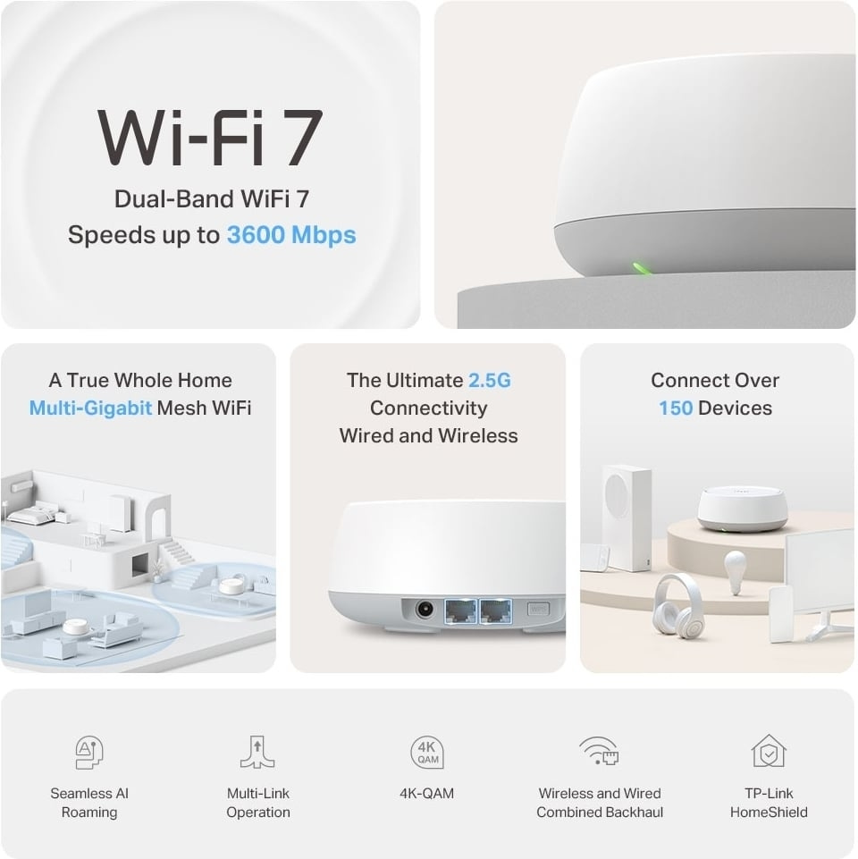 Deco BE25 er en Wi-Fi-løsning til hele hjemmet, der holder dit netværk stærkt uanset dit hjems størrelse og indretning. Basestationerne kan installeres til at bruge et trådløst eller kablet backbone-netværk eller en kombination af disse for at sikre den bedst mulige forbindelse mellem basestationerne. Systemet bruger ét netværksnavn og skifter forbindelse mellem basestationerne problemfrit ved hjælp af kunstig intelligens (AI-Driven Mesh) og er takket være multi-link-drift (MLO) i stand til at udnytte flere datatransportbånd og forskellige frekvenser effektivt. Systemet understøtter op til over 150 samtidige brugere. Deco BE25 er også kompatibel med WiFi 5- og WiFi 6-enheder. Det er nemt at udvide netværket med Deco-routere TP-Link.