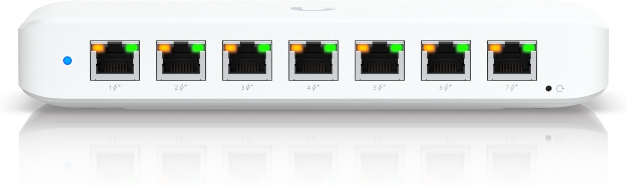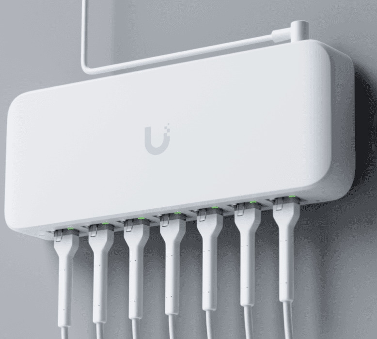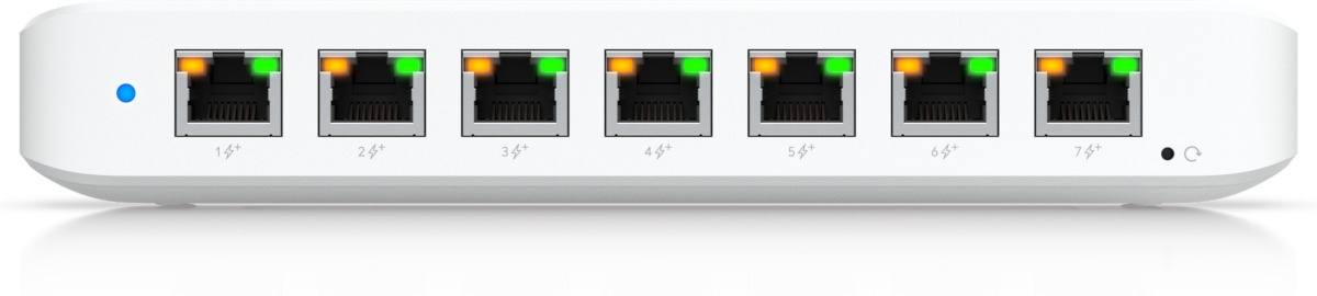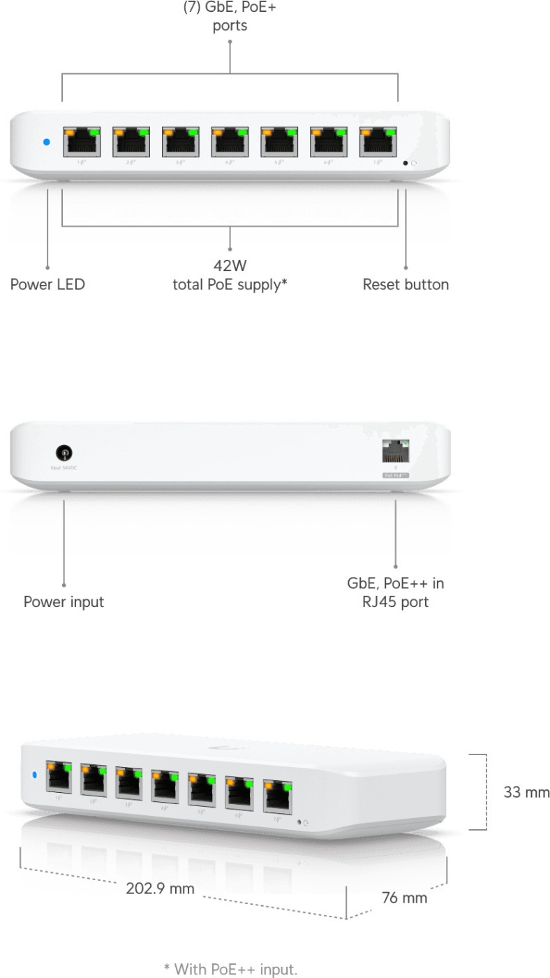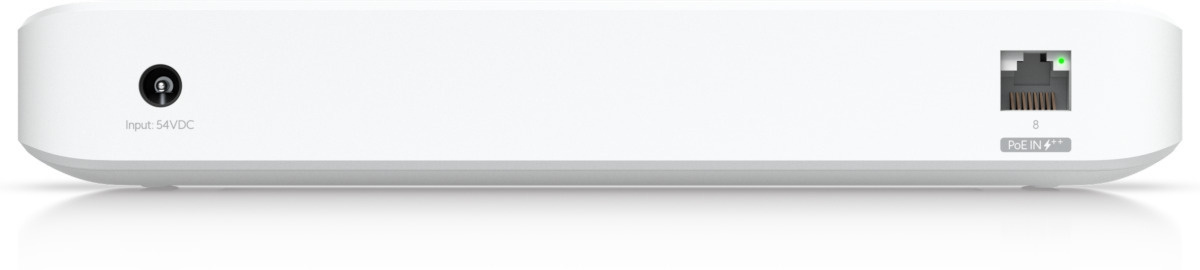 - 8 x Gigabit RJ-45-porte, hvoraf 7 x PoE+ Out og 1 x PoE++ In-understøttelse