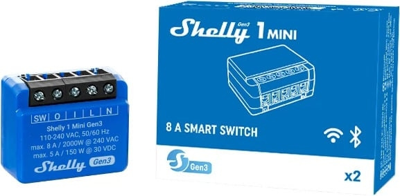 Shelly 1 Mini Gen3 er en meget kompakt Wi-Fi-styret smart kontakt til intelligent styring. Shelly Med 1 Mini Gen3-kontrollen kan du automatisk styre lys, garageport, vandingsanlæg eller andre små elektriske apparater, både når du er hjemme og når du er væk. Shelly 1 Mini Gen3 er lille nok til at passe ind i næsten enhver vægkontakt eller stikkontakt, og den kan også eftermonteres.