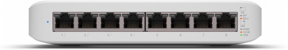 UniFi USW-Lite-8-PoE er en administrerbar Layer 2-switch. Enheden har otte Gigabit Ethernet-porte, hvoraf fire understøtter 802.3af/at PoE+