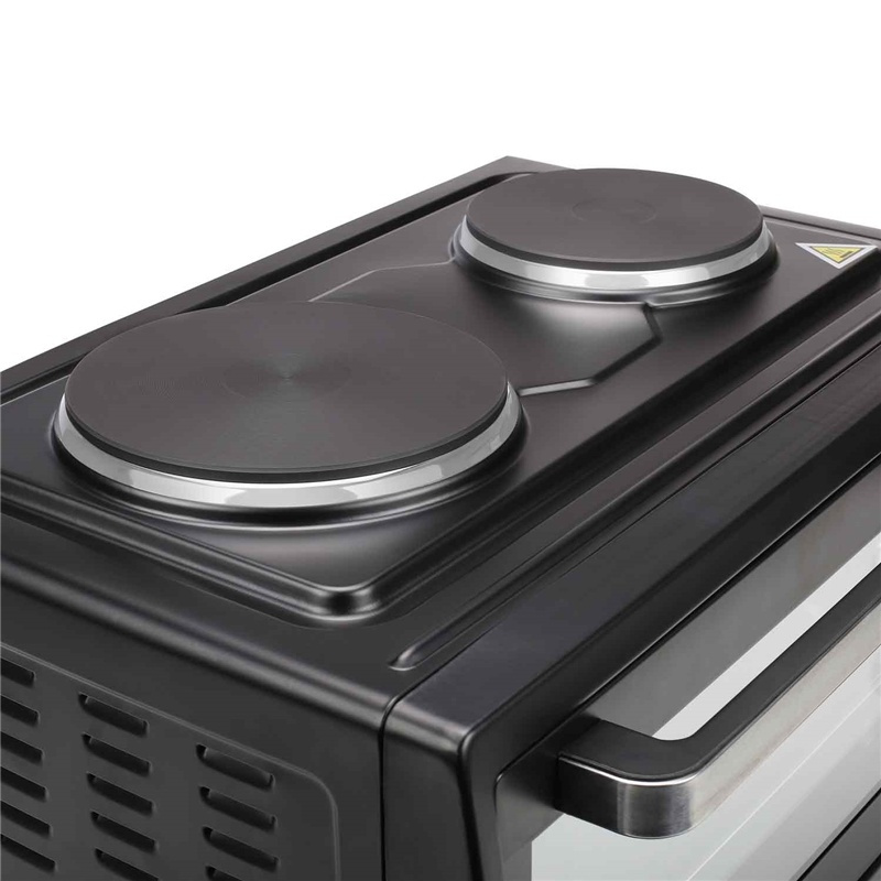 Unik kombination av en mycket stor ugn och 2 kokplattor 1000W + 600W. Ugnen har en kapacitet på 35L och är utrustad med övre och undre värmezoner. Försedd med en bakplåt, grillgaller och handtag. Perfekt minikök för varje hushåll. Ugnen är även utrustad med varmluft och belysning.