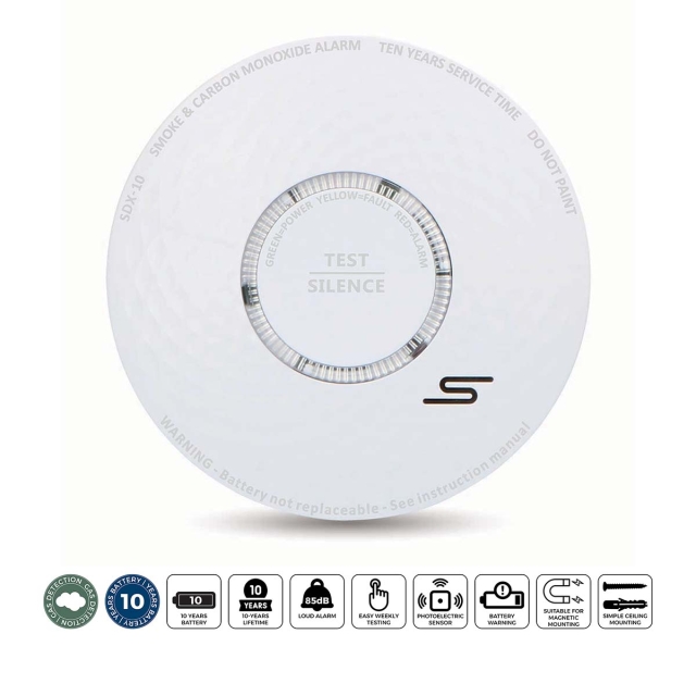 Alarmen er ekstra høj, så du ikke kan overhøre den. Du vil også kunne høre den i søvne. Der er en tys-tys-knap til midlertidigt at stoppe alarmen, når du har fundet brandårsagen og slukket den. Du kan installere den holdbare røg- og kuliltealarm i loftet. Monteringsmateriale medfølger, hvilket gør monteringen nem.