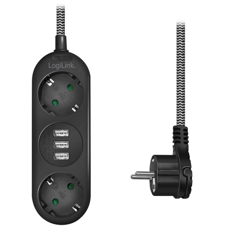 Två jordade uttag med petskydd och tre USB-portar för laddning. Uttagen sitter i 45° Vinkel och grenuttaget har en vinklad stickkontakt vilket gör den kan pluggas in i vägguttag bakom möbler.