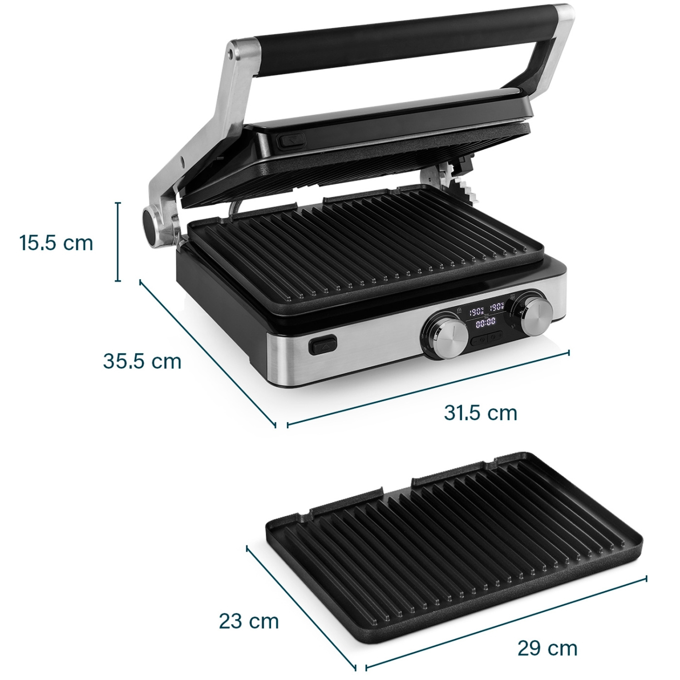 Denna högkvalitativa grill i rostfritt stål är enkel att använda via en digital kontrollpanel. Ställ enkelt in de olika temperaturerna via de 2 separata knapparna. Använd också den praktiska timerfunktionen. Detta gör att du kan baka din smörgås eller panini vid exakt rätt tidpunkt och grillen stannar aldrig längre än du vill.