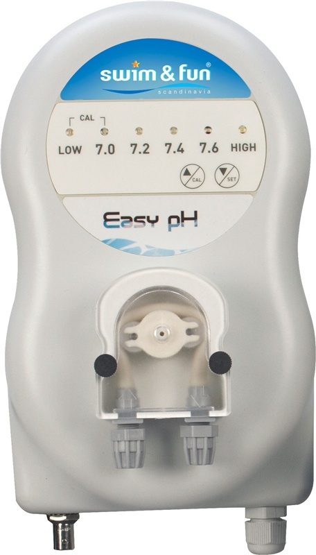 Med Easy pH installeret ved poolen behøver du ikke længere huske på at teste badevandets pH værdi. Easy pH tester og balancerer pH værdien automatisk i tilfælde af at pH værdien er for høj. Easy pH kan nedjustere pH værdien, men kan ikke opjustere pH værdien. I det meste af norden bliver vandet ofte for basisk og har derfor behov for tilsætning af syre for at nedbringe pH værdien. Hvad er pH PH er måling af badevandets surhed. Den vil altid variere afhængigt af påvirkning fra miljøet - f.eks. tilføres regnvand og vand forsvinder ved fordampning. Den idelle pH værdi for badevand i en swimmingpool er mellem 7,0 og 7,4. For at bibeholde en sund værdi, og undgå ubehagelige virkninger af for basisk badevand, er det vigtigt at vandet løbende balanceres. Det sørger Easy pH for. Sådan påvirkes badevandet af forkert pH værdi Hvis pH værdien ikke justeres løbende, kan man opleve flere forskellige negative virkninger. En af de væsentligste er, at vandplejemidlers desinfektionseffektivitet nedsættes markant. Ved en pH værdi på 8 er effektiviteten faktisk nedsat med hele 75%. De badende vil også kunne opleve at øjne bliver irriteret, vandet lugter mere af klor, og huden bliver øm og tør. En forkert pH balance kan også forårsage korrosionsskader på stiger og andet udstyr af metal. Vandet kan blive uklart og der kan sætte sig kalkaflejringer på liner og udstyr. Hvad er en Easy pH regulator" Easy pH er en kompakt automatisk regulator med indbygget doseringspumpe. Regulatoren er koblet til en sonde, som er monteret i cirkulationssystemet. Sonden måler løbende pH værdien i vandet. Easy pH regulatoren forbindes med slange til en beholder med et pH balancerende middel. Regulatoren sammenligner nu badevandets aktuelle pH værdi med den idelle. Hvis pH værdien er for høj tilfører regulatoren pH balancerende middel til vandet indtil det idelle pH niveau er reetableret. Vedligeholdelse af Easy pH Easy-pH holder automatisk badevandet i perfekt balance. Du skal blot sørge for fylde mere pH regulerende middel på systemet når det er løbet tør. En lysalarm på Easy pH fortæller dig når beholderen er tom. pH regulerende middel Når pH værdien skal sænkes, anbefaler vi flydende svovlsyre 32%. Specifikationer Reguleringstype: ph- (default) eller ph+ Reguleringsmiddel syre (ph-): Flydende Svolvsyre 32% Reguleringsmiddel base (ph+): Flydende Kalcineret Soda Maksimal pool volume liter / m3: 80.000 / 80 Styreenhed: IP65 vandtæt (vandsprøjt) Alarm: Ja, ved for høj eller for lav pH Visning af pH værdi: 6 LED Flowhastighed pumpe liter/time: 2,4 Sætpunktsindstilling: 7,0 til 7,6 Kalibrering pH sonde: i 1 punkt Slange: 5 m Kabinet størrelse LxHxD (mm): 140x230x80 Vægt komplet apparat kg: 2,9 EAN: 5704841018150 Produceret i Frankrig