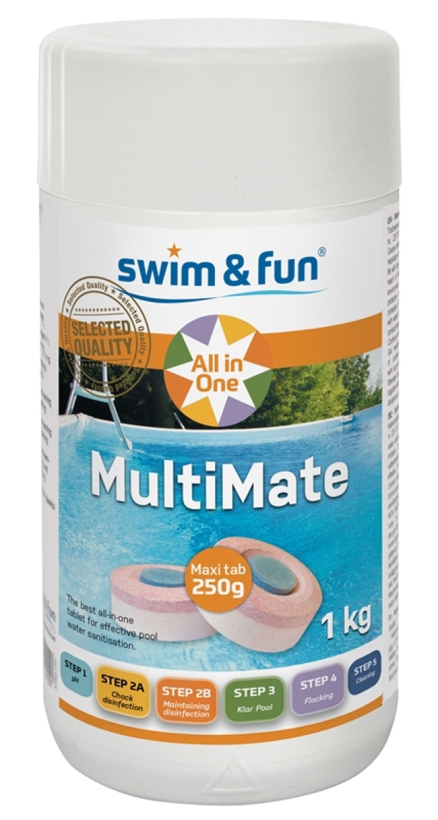 MultiMate kombinerer på unik vis hurtig grunddesinfektion af poolvand med opretholdelse af høj vandhygiejne over tid. Nemt og effektivt! Tabletten er opdelt i 3 faser: pink, blå og hvid. Den pink del af tabletten består af hurtigtopløseligt klor som chok-desinficerer poolvandet og sørger for en tilbundsgående desinfektion, hver gang en ny tablet tilsættes. Den hvide del af tabletten indeholder langsomtopløseligt klor med multieffekt. Det vil sige at vandet, udover den desinficerende klor, langsomt får tilført en kombination af følgende plejemidler: Flokningsmiddel, der samler mikroskopiske flydeemner til større enheder, som nu nemmere opfanges af filtersystemet. PH stabilisator som gør det nemmere at holde et jævnt pH niveau samt flydende hårdhedsstabilisator, der binder vandets metaillioner så vandet ikke misfarves af f.eks. kobber og jern i vandet. Samtidig forebygges kalkudfældning og dermed kalkaflejringer på poolliner og udstyr. Tablettens blå del forebygger effektivt glatte og slimede belægninger, så en ubehagelig glat og slimet overflade på poolens liner, bund og udstyr undgåes. MultiMate placeres direkte i skimmeren og doseres med 1 tablet pr. 35 m3 poolvand. En ny tablet tilsættes når der er ca. 10% tilbage - normalt efter ca. 7 dage. Det anbefales at teste klorindhold og pH balancen jævntligt og holde indholdet af frit klor mellem 0,5 og 1,5 mg/l. Tabletten kan ikke benyttes i inline klorinatorer eller i flydende klordispensere. Vær ekstra opmærksom på at koncentrationen af plejemidler ikke bliver for høj i vandet omkring skimmeren, i perioder hvor cirkulationssystemet ikke er i drift.