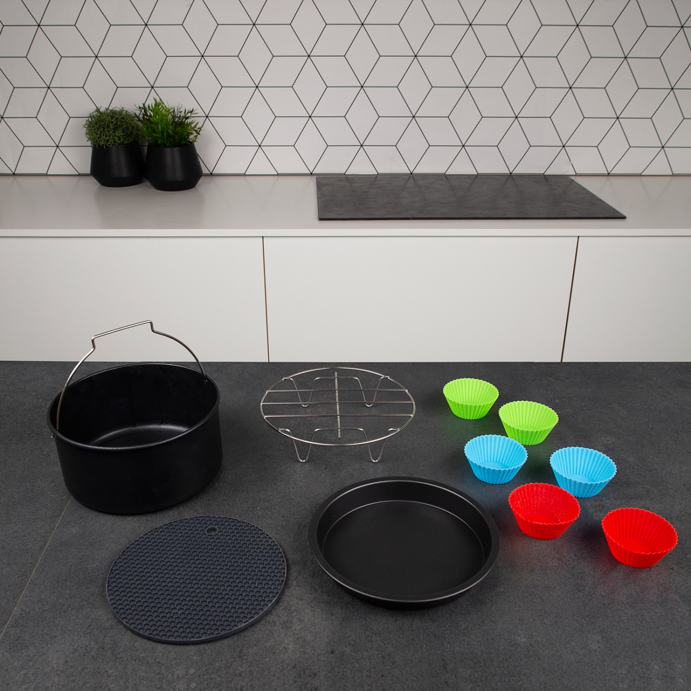 Tillbehörspaketets kakform och sex muffinsformar i silikon ger en ny dimension till användningen av varmluftsfritösen.