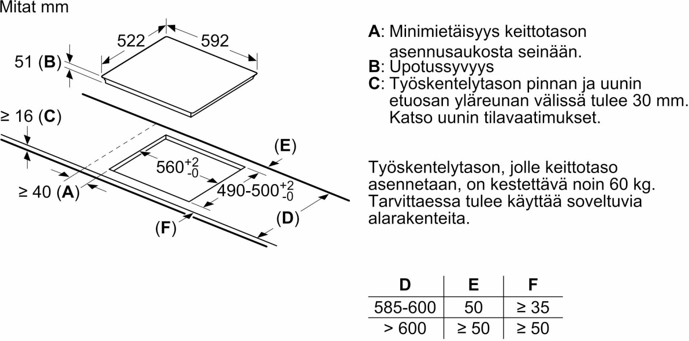 - Installationsmål H x L x B (mm): 51 x 560 x 490-500
