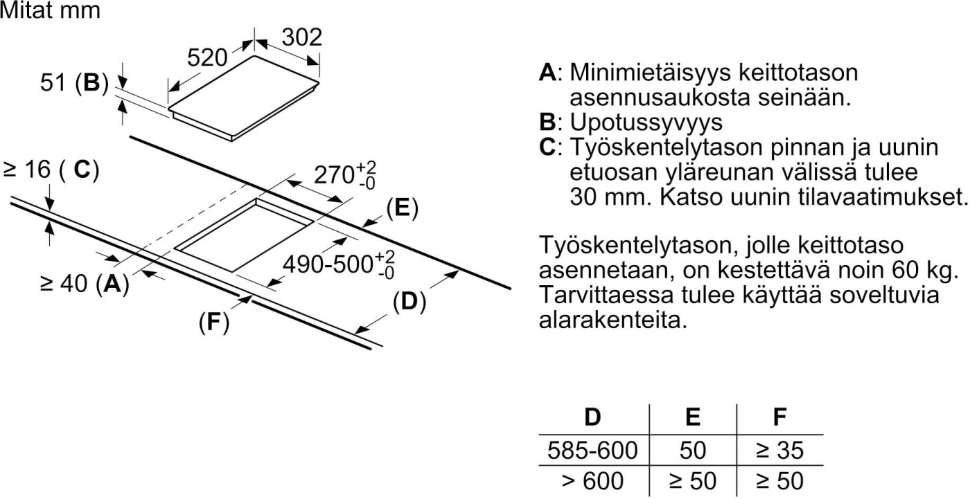 - Mål H x B x D (mm): 51 x 302 x 520