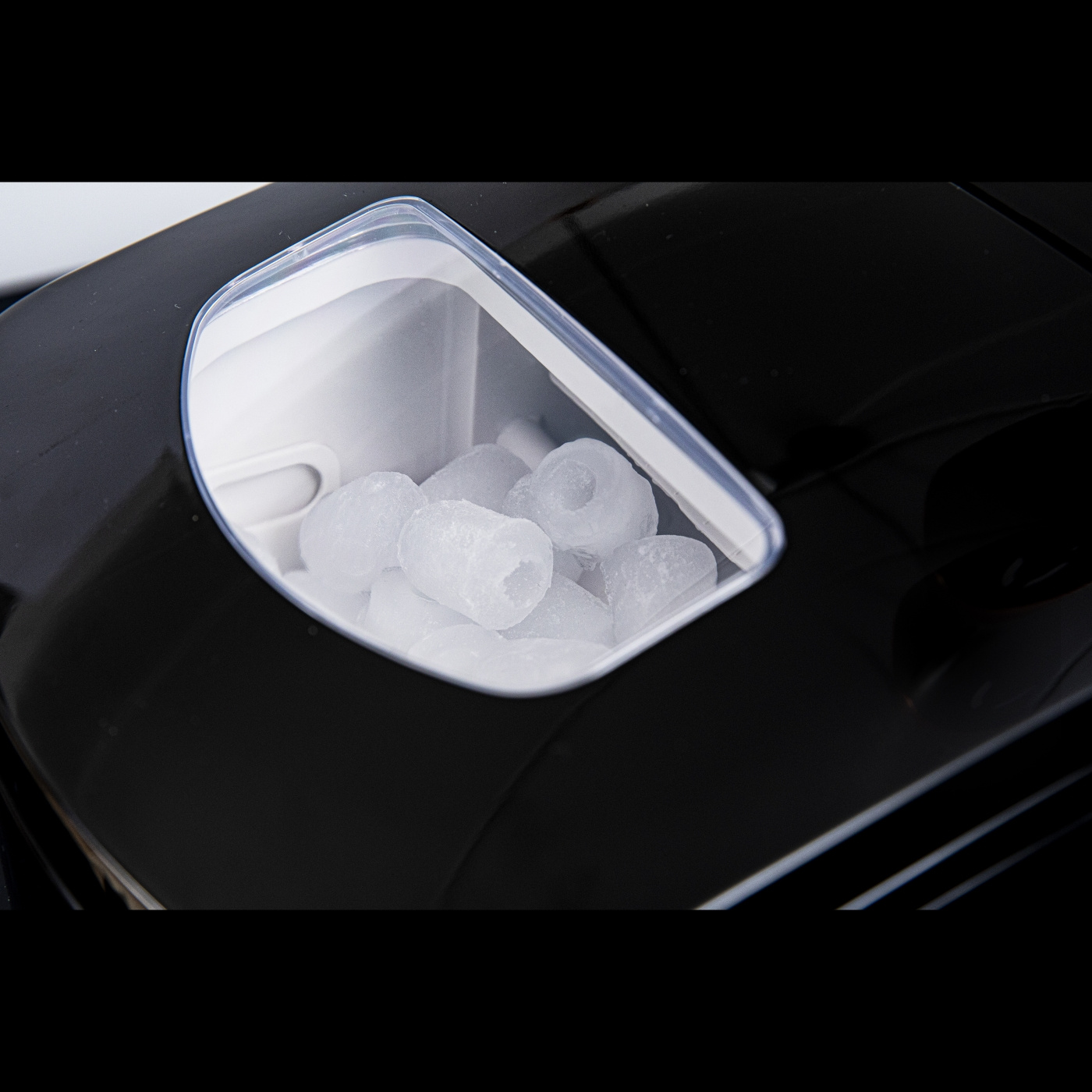 Maskinen er meget brugervenlig - fyld beholderen med vand, vælg den ønskede isterningestørrelse på knapperne øverst, og start maskinen. Den slukker automatisk, når isbeholderen er fuld, og et LED-lys viser, hvornår der skal fyldes vand på.