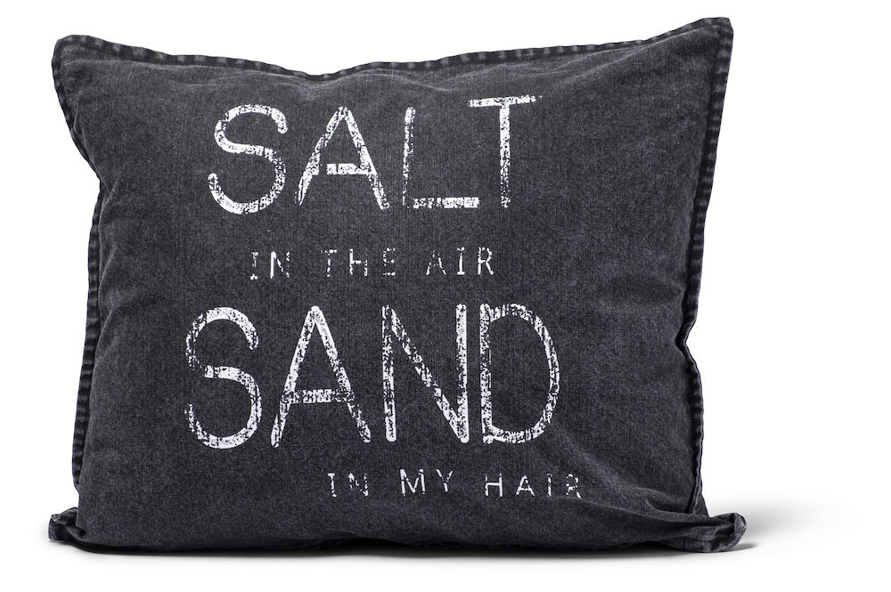 Kuddfodral av bomull med texten “Salt in the air, Sand in my hair”.