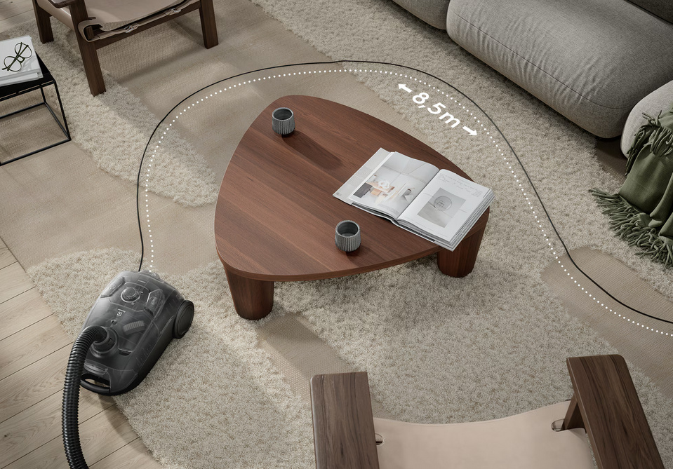 Denne ergonomiske støvsuger giver dig mulighed for at rengøre op til 72 kvadratmeter uden at skifte stikkontakt. Med teleskoprør, store hjul og 8,5 meters rækkevidde kan du bevæge dig glat og rengøre uden afbrydelse.
