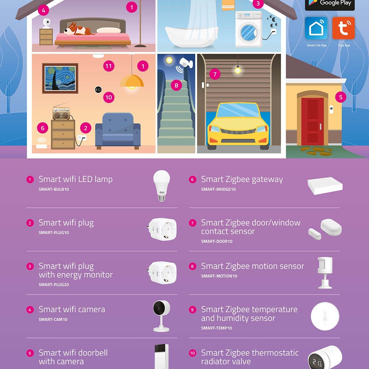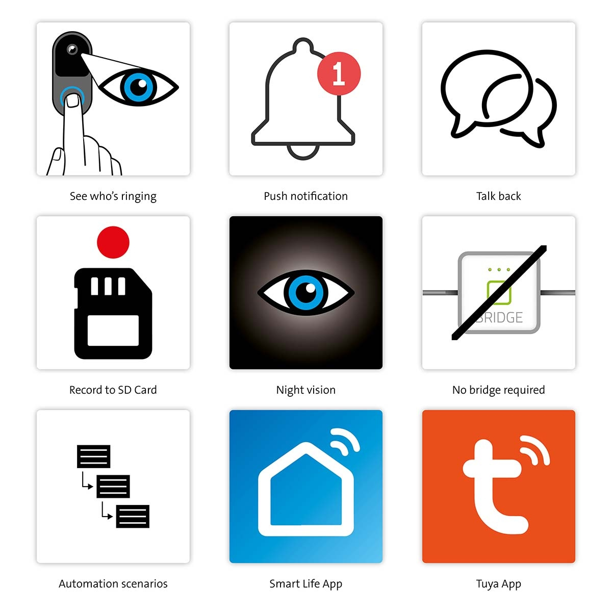 Den trådløse dørklokke fungerer på WiFi og kan tilsluttes direkte til (hjemme)netværket uden problemer. Der kræves ingen bro eller gateway til dette. Dørklokken er forbundet med den gratis Smart Life-app fra Tuya, som kan downloades gratis til alle iOS- og Android-enheder. Alle Alecto Smart Life-produkter kan administreres i denne app.