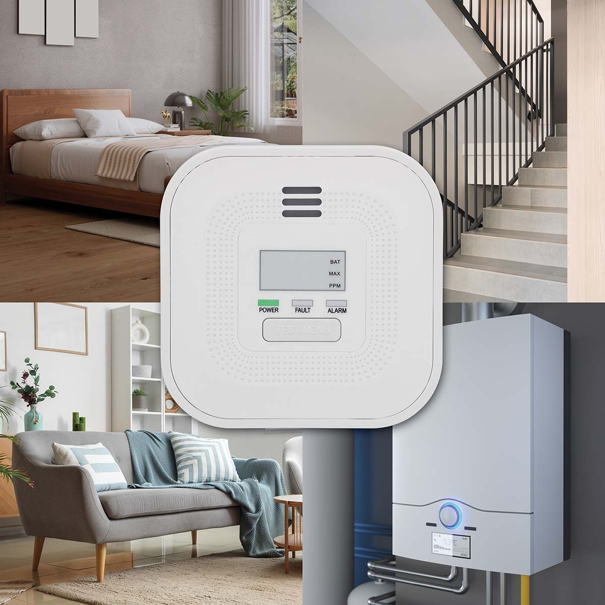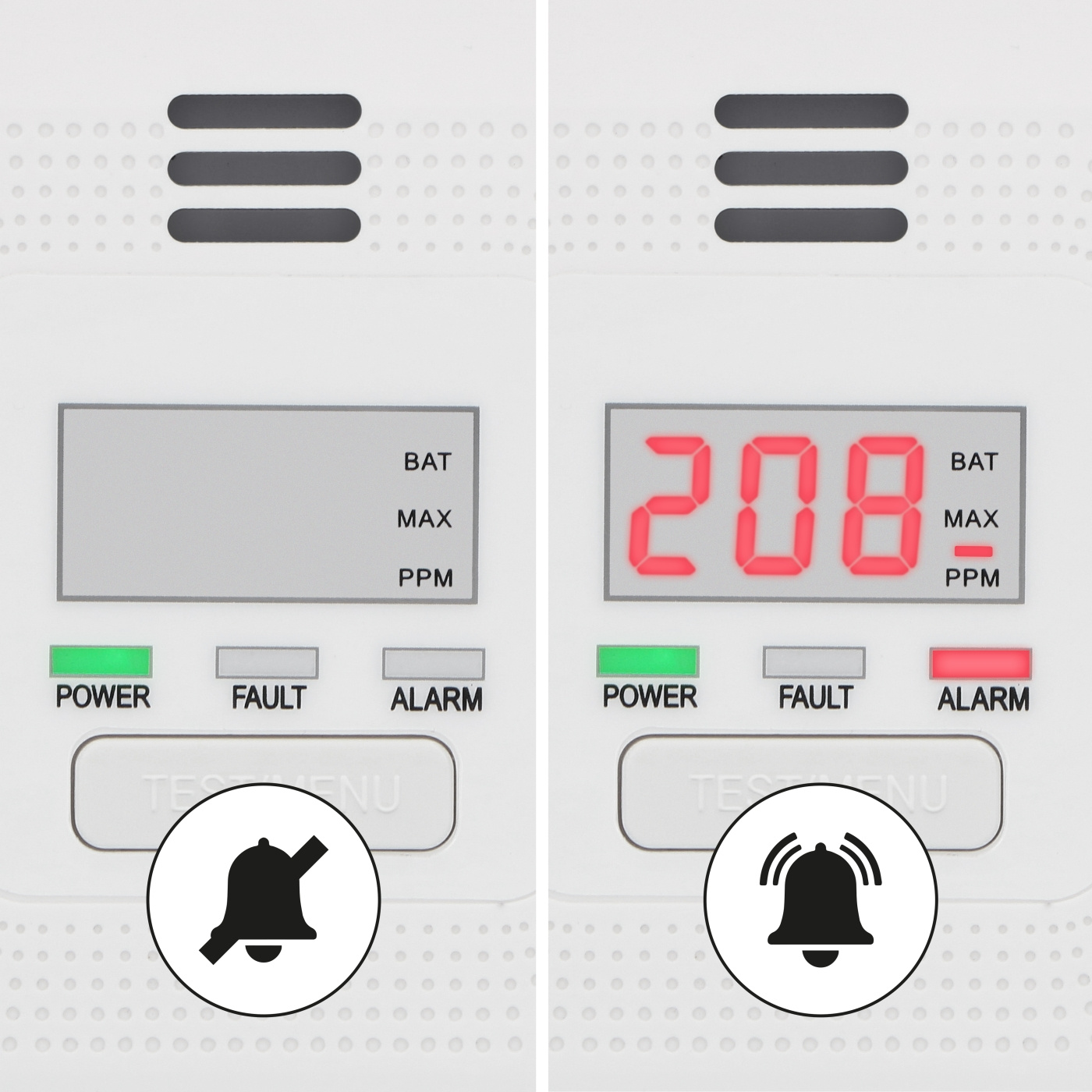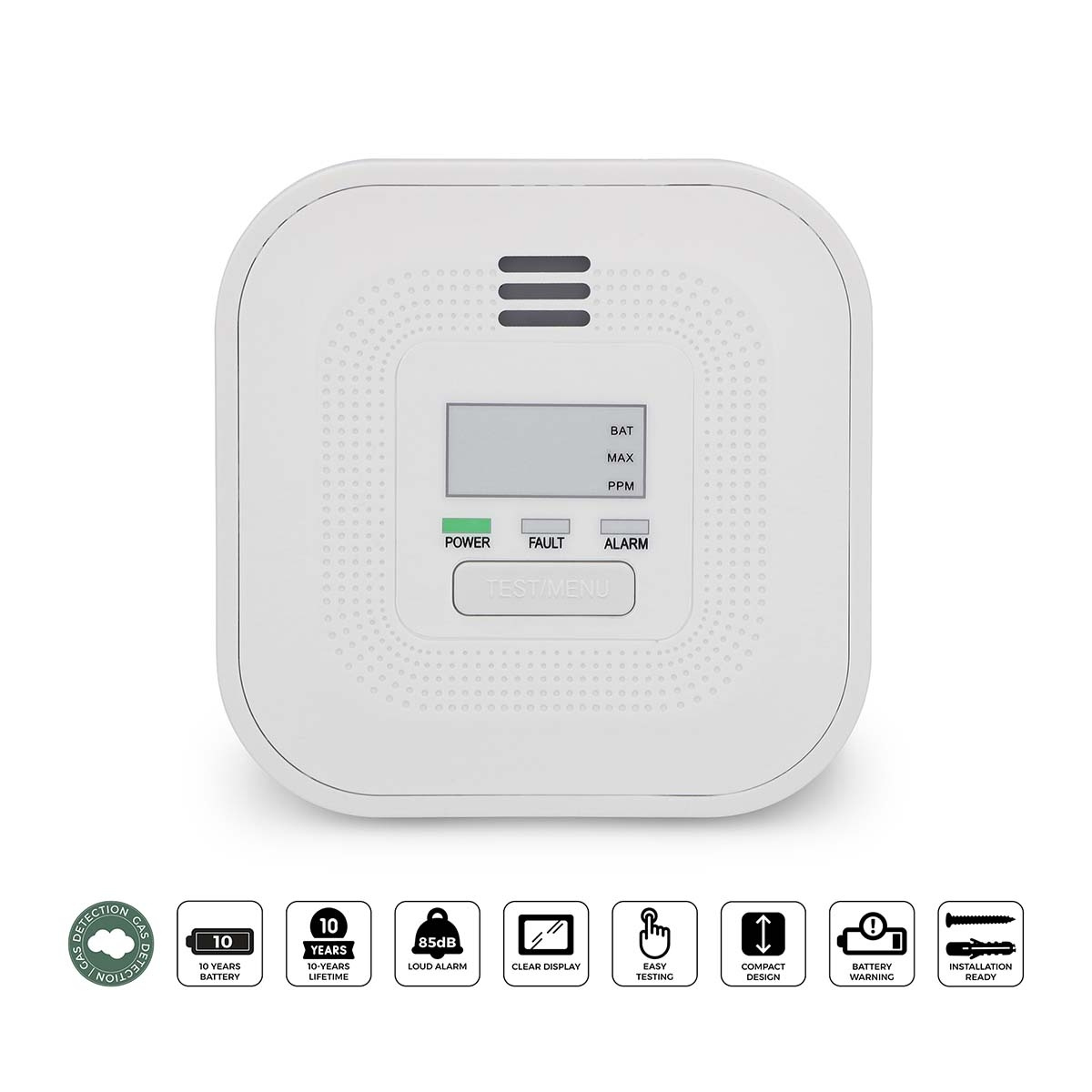 Alecto COA4010 kuliltealarm giver pålidelig og langvarig beskyttelse mod kulilte (CO) i dit hjem. Så snart der registreres kulilte, advarer alarmen straks med lyd, lys og en tydelig meddelelse på displayet. Udstyret med en 10-års sensor og et kraftigt indbygget litiumbatteri garanterer denne CO-alarm kontinuerlig, vedligeholdelsesfri sikkerhed i et helt årti. Takket være det integrerede display kan du nemt aflæse CO-koncentrationsniveauer, batteristatus og andre vigtige meddelelser med et enkelt blik. I modsætning til mange alarmer med display sikrer Alecto COA4010's litiumbatteri 10 års optimal drift uden udskiftninger. Alarmen advarer ikke kun om høje CO-koncentrationer (>:50 ppm), men giver også besked ved lave niveauer (<:20 ppm), så du kan handle, før der opstår sundhedsrisici. Når koncentrationen bliver farlig, sikrer en høj alarm på 85 dB, at du bliver advaret med det samme - selv mens du sover. Installationen er enkel med den medfølgende monteringsplade, skruer og stik, men COA4010 kan også placeres fritstående på en plan overflade. Den er kompakt og bærbar (40 × Ø110 mm), så den er også ideel til at tage med på ferie.