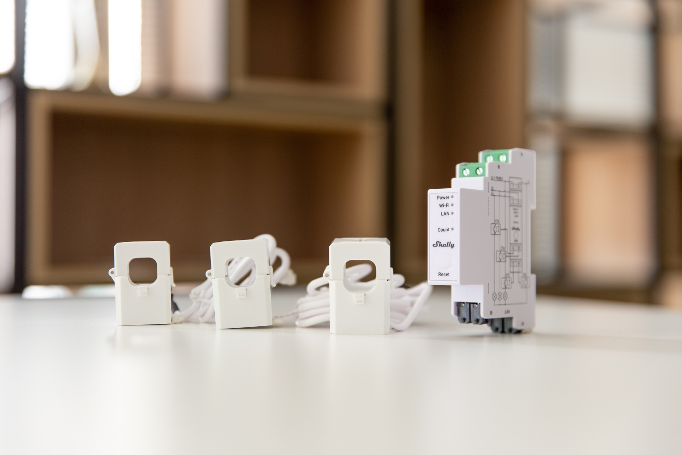 Shelly Pro3 EM er en 3-faset energimåler, der ved hjælp af transformator-klemmer måler energi i tre individuelle faser med en belastning på op til 120 A og en nøjagtighed på 99 %. Enheden rapporterer i realtid den akkumulerede energi samt den øjeblikkelige spænding, strøm og effektfaktor for hver fase. Den gemmer data i et ikke-flygtigt hukommelse, som kan hentes op til 60 dage tilbage med 1 minuts intervaller.