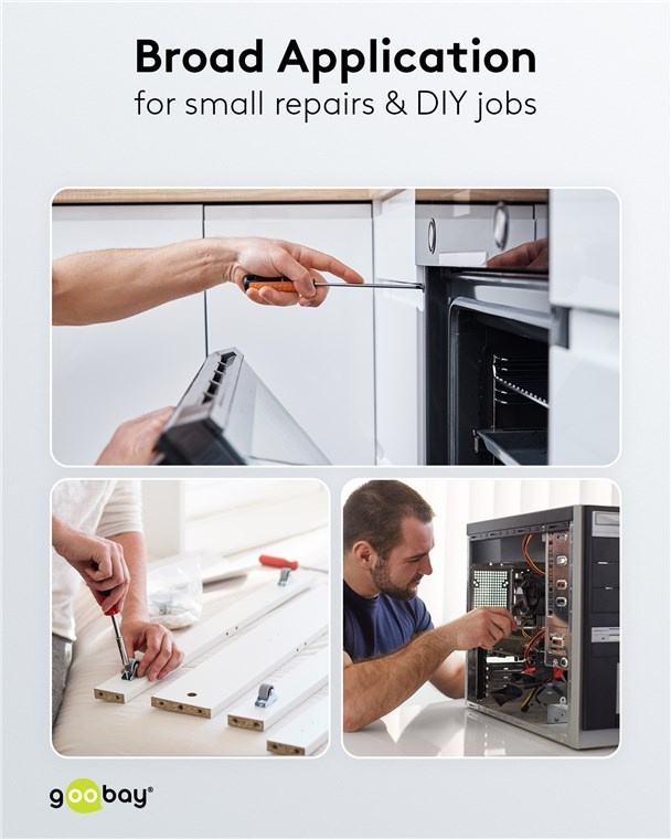 - Kompakt bitssæt med basisudstyr til små reparationer og gør-det-selv-arbejde, f.eks. på pc'en, ure, briller eller husholdningsapparater