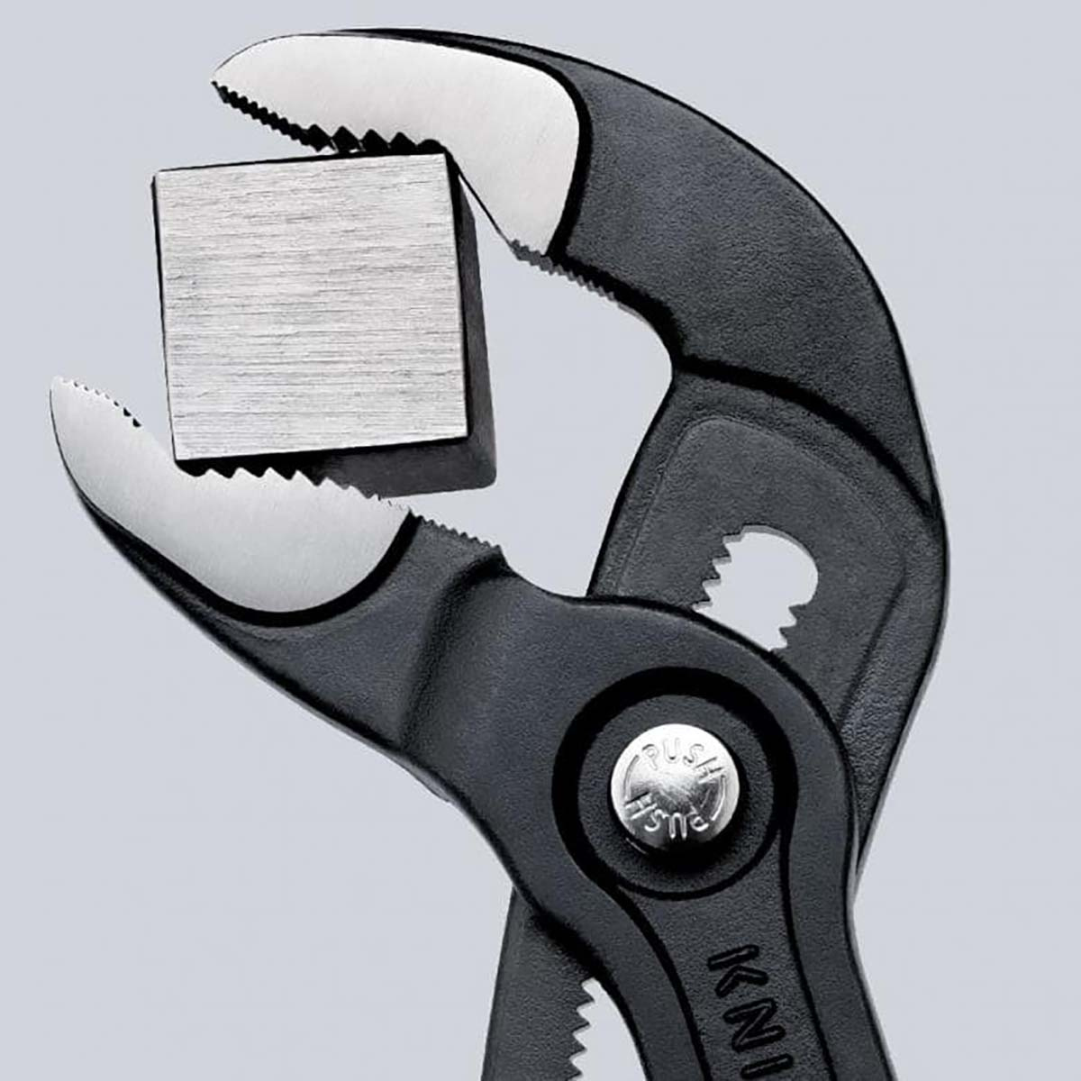 ● Tryk på knappen for justering på emnet ● Finjustering for optimal tilpasning til forskellige størrelser af emner og en behagelig håndtagsbredde ● Selvlåsende på rør og møtrikker: ingen glidning på emnet og lav håndkraft påkrævet ● Gribeflader med specialhærdede tænder, tændernes hårdhed ca. 61 HRC: høj slidstyrke og stabilt greb ● Box-joint design for høj stabilitet på grund af dobbelt føring ● Pålidelig fangst af hængselsbolten: ingen utilsigtet forskydning ● Klembeskyttelse forhindrer operatørens fingre i at blive klemt ● 125 mm lille, gribekapacitet til rør Ø 29 mm, gribekapacitet til møtrikker Ø 27 mm, vægt 85 g ● Kromvanadium elektrisk stål, smedet, flertrins oliehærdet