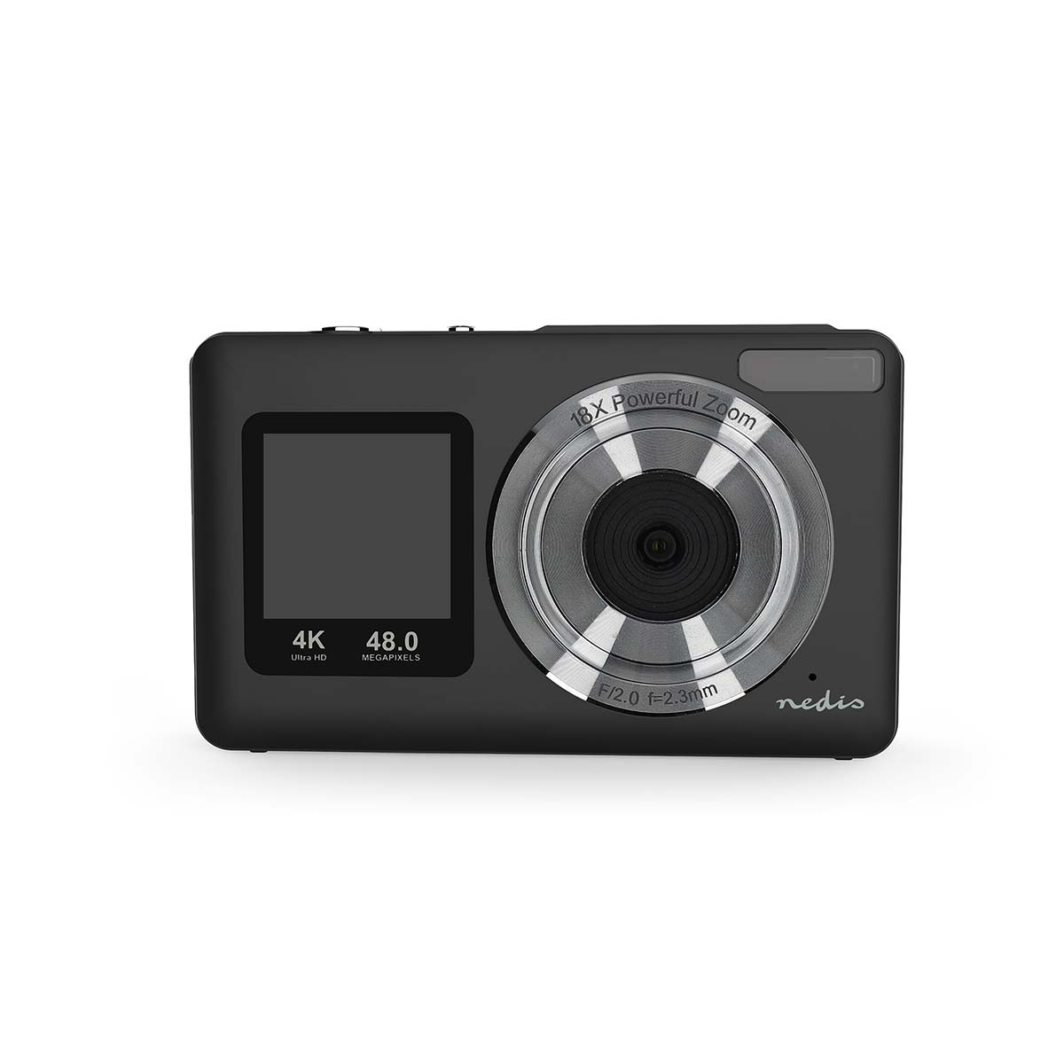 Nedis-kameraet har to HD-skærme: en 2,5-tommers skærm på bagsiden til at indramme dine billeder og en 1,3-tommers skærm på forsiden, der er perfekt til selfies og vlogs. Integreret mikrofon og højttaler understøtter klar lydoptagelse, mens USB-forbindelsen gør det muligt at bruge webkameraet til livestreaming.
