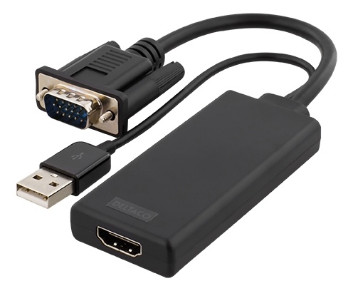 DELTACO VGA to HDMI adapter, audio via USB, 1080p, 1xVGA M, 1xHDMI FM, 1xUSB Type A M, black