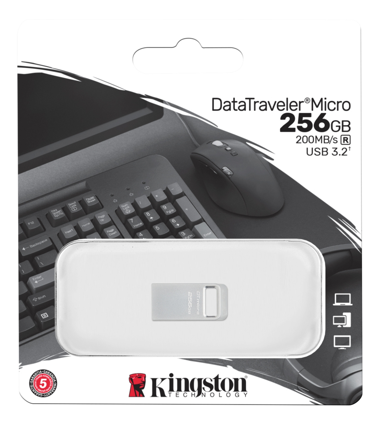 DataTraveler® Micro is an ultra-small, lightweight USB drive ideal for convenient plug-and-stay storage that’s compatible with computers, printers, gaming consoles and more. The drive is designed with a low-profile, premium metal casing and built-in key loop to leave in USB ports without interference. DT Micro delivers USB 3.2 Gen 1 speeds up to 200MB/s read and up to 256GB capacities to quickly transfer and store large files such as movies, music, games and photos.