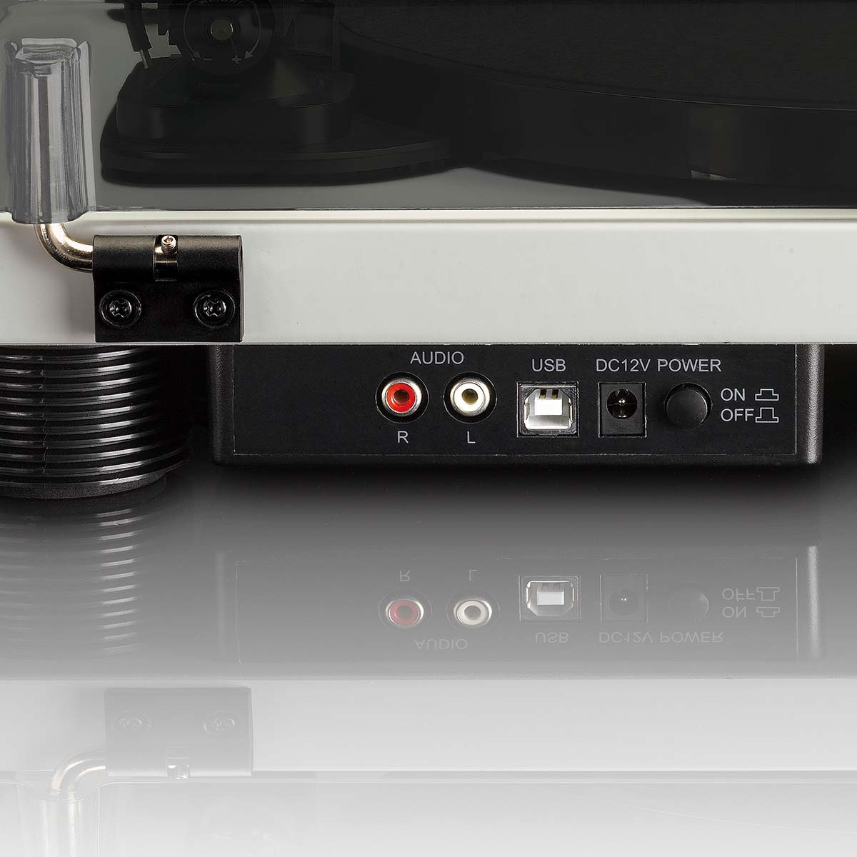 Uanset hvilken plade du lytter til, kan du nemt skifte fra 33 til 45 eller 78 RPM. Hvis du vil have mere lydstyrke, kan du bruge eksterne højttalere og RCA-tilslutningen på bagsiden af pladespilleren. På den måde bliver alle rum fyldt med musik. Vil du også lytte til din yndlingsplade via din bærbare computer eller telefon? Du kan overføre din fysiske plade til digitale filer på ingen tid via USB-porten.
