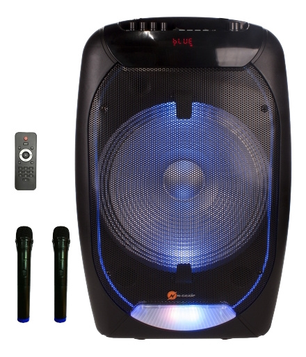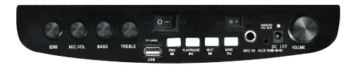 • Peak Power 30W • Power input DC 15V,2A • Peak Power PMPO 500W • Frequency Response 50Hz-20KHz • Woofer size +impedance 15 inch 3ohm • Tweeter size +impedance 1 inch • S/N Ratio ≥72dB • Battery type Lead acid • Battery capactity 2600 mAh • Battery Playing Time (Max vol.) 2 hours • Battery Playing Time (50% vol.) 3.5 hours • Battery Playing Time (Low vol.) 6 hours • Battery Charging Time 4 hours • Battery weight 800gr • Bluetooth Version 4.0 • Bluetooth frequency 2400-2483.5MHz • Wireless Mic frequency 210.3MHz • USB MP3 Max 64GB - 20.000 songs • MicroSD/TF MP3 Max 32GB - 10.000 songs