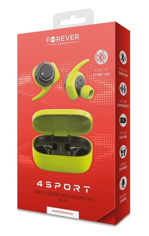 Forever 4Sport TWE-300 TWS hörlurar är det perfekta valet för människor som lever en aktiv livsstil. Du behöver inte oroa dig för att dina hörlurar faller ur öronen medan du tränar på gymmet, springer i löparspåret eller helt enkelt diggar järnet till din favoritlåt. Deras lätta, minimalistiska design passar perfekt i de allra flesta öron och ger komfort under de mest krävande träningspassen. Tack vare TWS (True Wireless Stereo) -teknik låter TWE-300 dig njuta av högkvalitativ musik utan problem och utan sladd som bara är i vägen. Lurarna erbjuder en generös räckvidd på 10 meter.