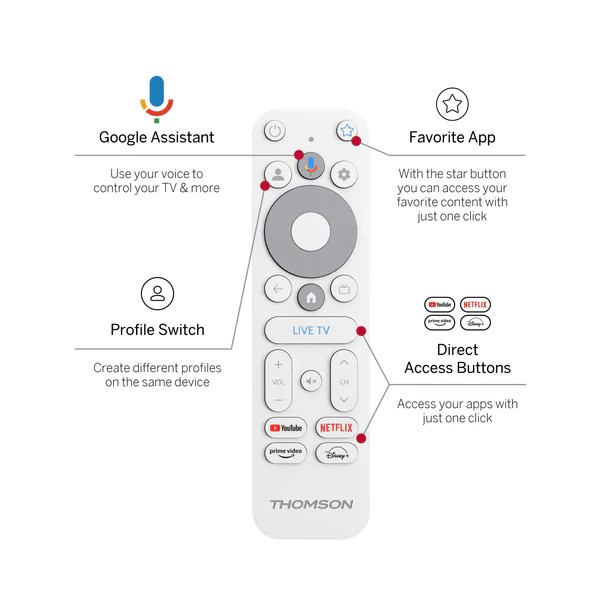 Den medfølgende fjernbetjening er designet til komfort og hastighed med Google Assistant stemmestyring. Sig blot, hvad du leder efter – fra trendy YouTube-klip til den nyeste blockbuster – og lad donglen klare resten. Hurtigtaster giver hurtig adgang til dine mest brugte apps.