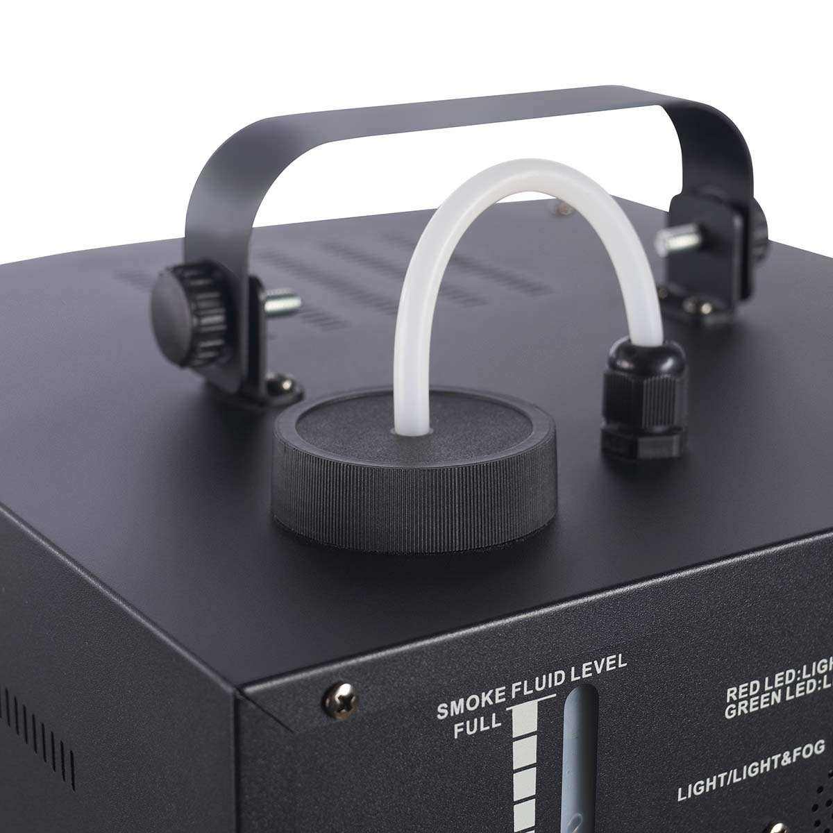 Røgenheden kan også bruges separat uden belysning. Tanken har en kapacitet på 1 liter, hvilket er nok til en times røg. Hvis du vil have røg i 5, 10, 15 eller 20 sekunder, kan du gøre det ved hjælp af den medfølgende trådløse fjernbetjening. Eller du kan generere røgen manuelt. Tågevæsken kan købes separat (Lenco FML-100). Røgmaskinen har en effekt på 900 watt med en hurtig opvarmningstid og er derfor klar til brug i løbet af få minutter.