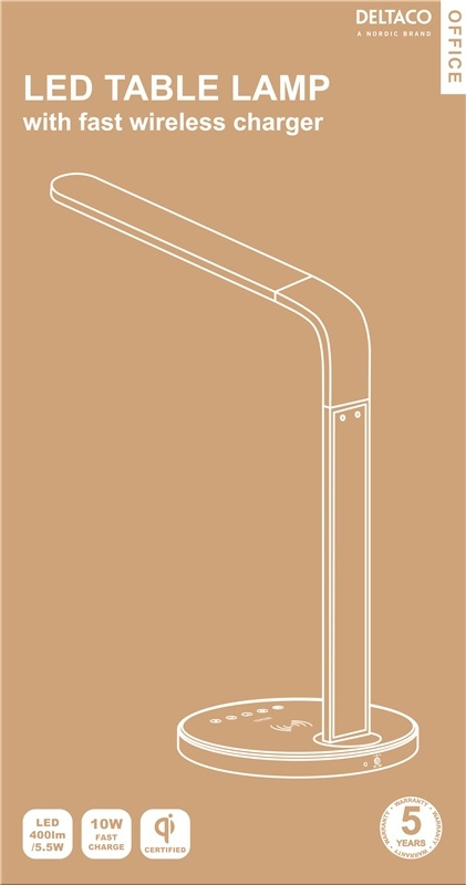 DELO-0401 fra DELTACO OFFICE er en stilfuld og elegant bordlampe med indbygget trådløs opladning, som er praktisk til din smartphone eller anden enhed, der er kompatibel med trådløs opladning på bundpladen med op til 10W hurtig-opladning. Den har en justerbar arm, der giver mulighed for fleksibel placering af lampehovedet også har den 3 touch-knapper samt 40 lysdioder, så du kan finde den farvetemperatur, du bedst kan lide. Perfekt til dit skrivebord, men også til dit natbord. Du kan bruge timerfunktionen til automatisk at slukke lampen. Det subtile, men stilfulde design ser godt ud i alle interiører
