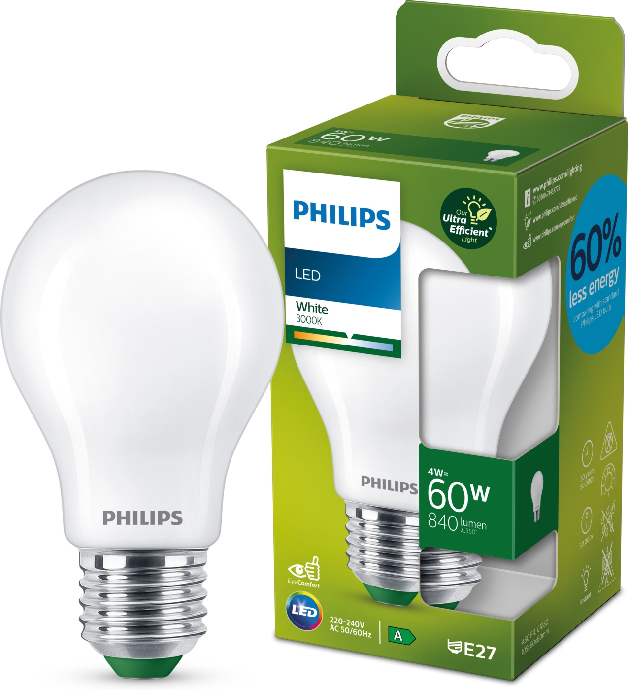Denna Philips Ultra Efficient-lampa är designad för att se lika snygg ut både av och på. Philips Ultra Efficient-lampan är klass A enligt den nya energiklassificeringen, lampan förbrukar endast 4 W el och producerar samma mängd ljus som den tidigare 60 W-glödlampan. Philips LED-lampor erbjuder vackert och varmvitt ljus, en exceptionellt lång livslängd och omedelbara och betydande energibesparingar. Den stilrena och elegant designade lampan ersätter glödlampor perfekt med en opal yta. Lampan förbrukar cirka 60 % mindre energi än en vanlig Philips LED-lampa och dess livslängd är upp till 3,5 gånger så lång som en vanlig Philips LED-lampa.