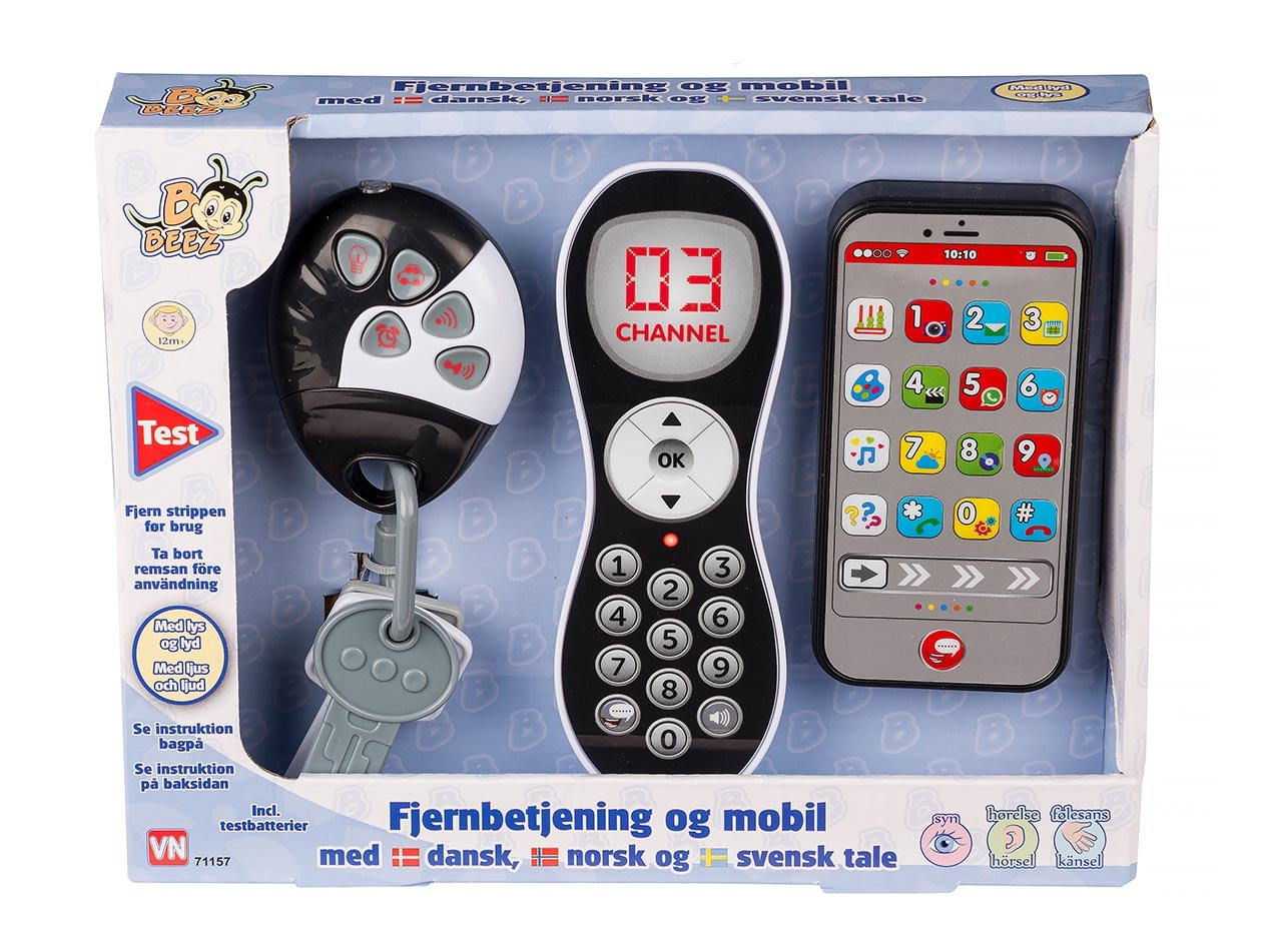 Sæt med fjernbetjening og mobiltelefon med dansk tale samt bilnøgler med lys og lydeffekter. Skift mellem dansk, norsk og svensk på fjernbetjeningen og mobiltelefonen. Inkl. 6 stk. AAA-batterier