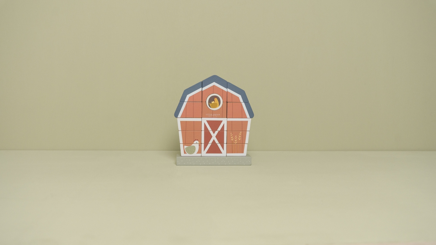 Den stabelbare bondegård er et sjovt bondehus, hvor du placerer træklodserne i den rigtige rækkefølge, og det bliver til et sjovt bondehus med en hane, der kigger ud gennem det øverste vindue, og en høne, der holder øje med huset ved døren.
