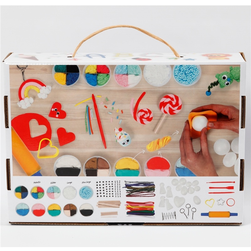 Innehåller: Silk Clay, Foam Clay, Foam Clay glitter, Foam Clay L, Foam Clay XL, kavel, utsticksformar, modelleringspinne, frigolitkroppar, frigolithjärtan, frigolitufo, frigolitkulor och -ägg, träpinnor, glasspinnor, självhäftande rullögon, fjädrar och nyckelringar.