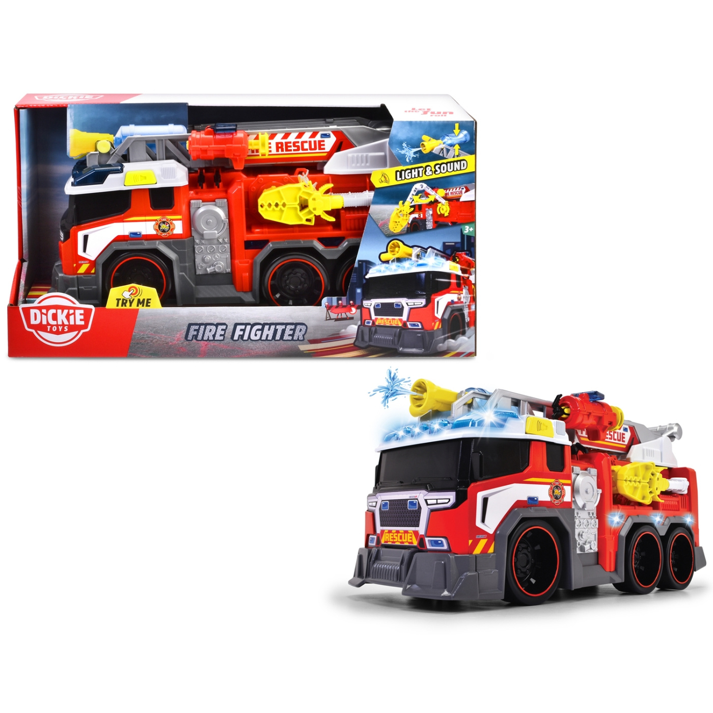 Denna brandbil från Dickie Toys har en vrid- och utdragbar steg samt detaljerade funktioner från välkända brandbilsmärken. Den imponerande brandbilen har även frihjul, ljus- och ljudeffekter samt en vrid- och utdragbar stege med stöttande ben.