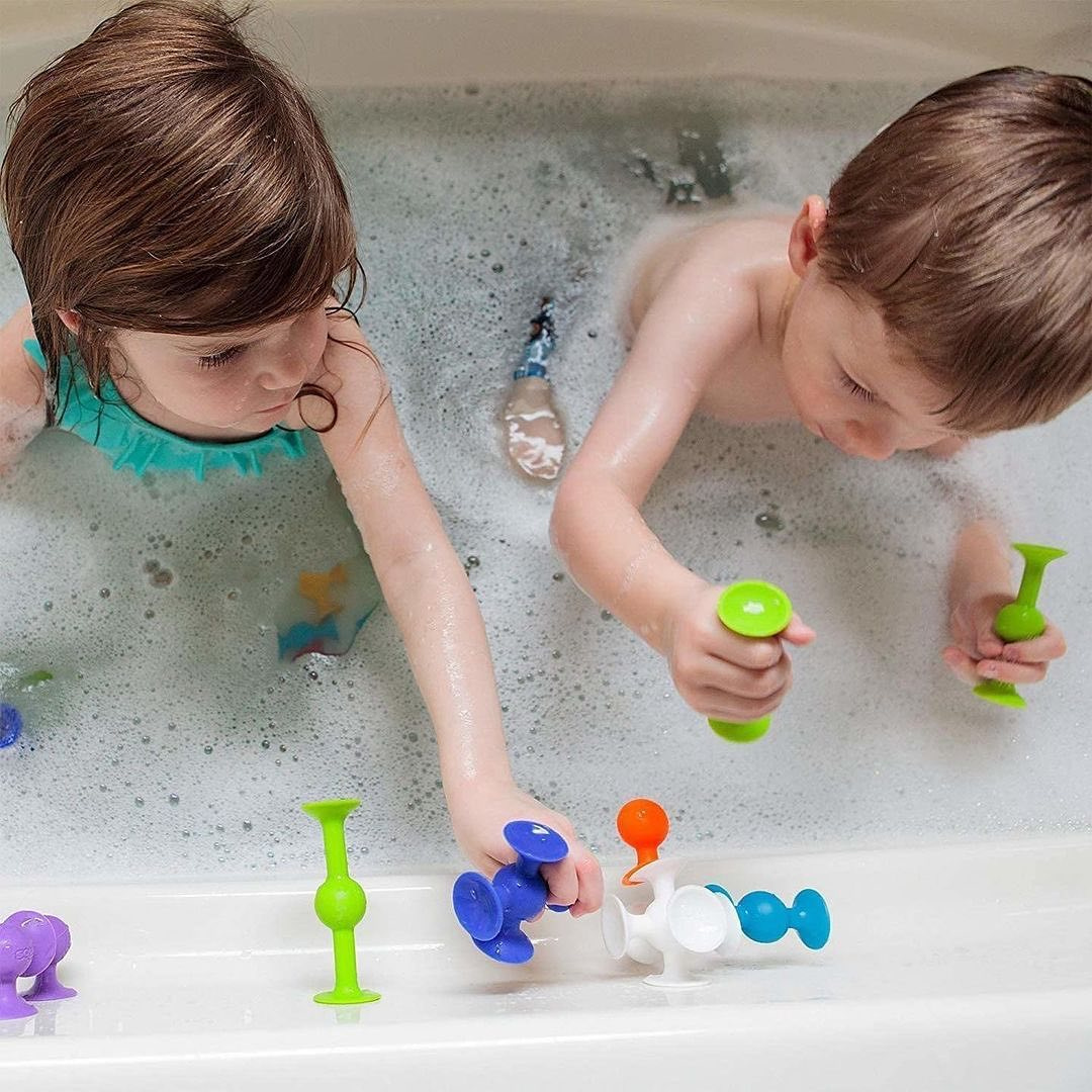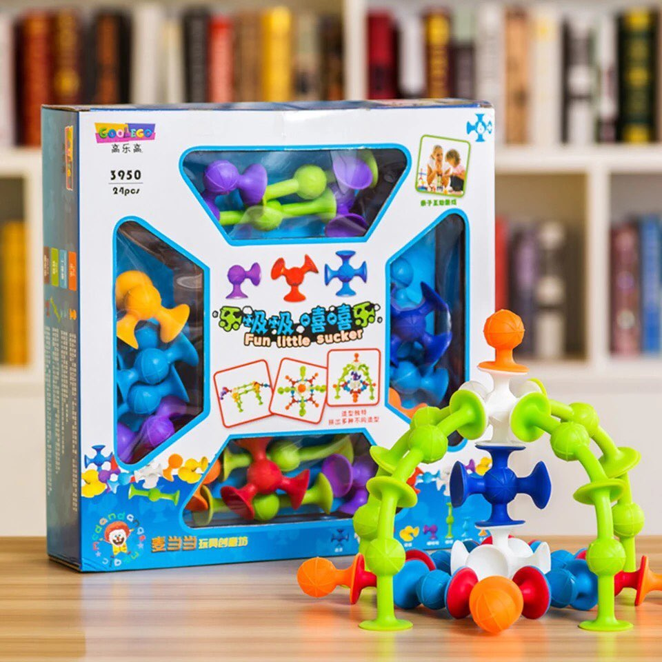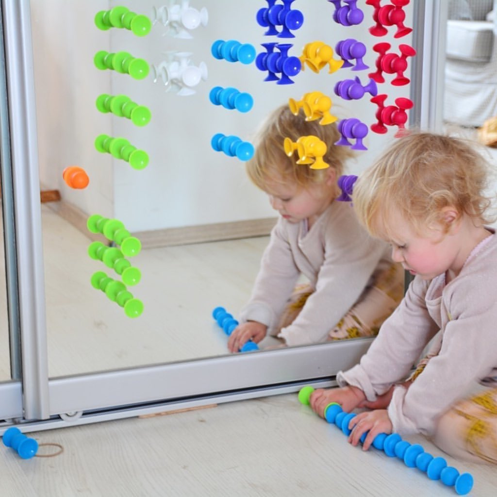 Byggklossarna har en sugpropp i varje ända vilket gör att de kan fästas i varandra men även på de flesta rena ytor som golv, väggar, badkar, speglar mm. Varje paket kommer med 24 st. byggklossar i olika roliga färger, perfekt för lek och inlärning!