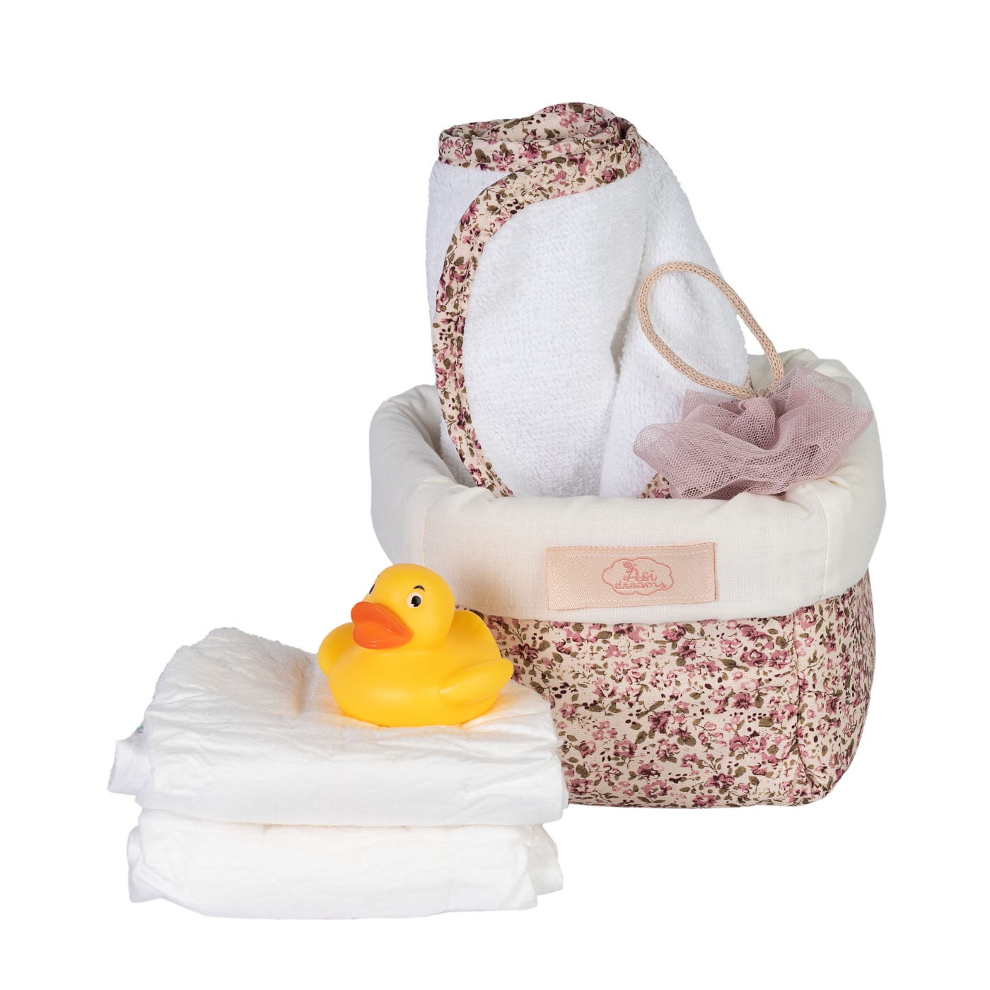 Dukkepuslekurven fra ASI er det perfekte tilbehør til dukkeforældre. Dette charmerende sæt indeholder to bleer, et lille håndklæde, en praktisk badesvamp og en sød, gul badeand. Kurven har et vintage blomsterprint i pink, som gør den både funktionel og stilfuld.