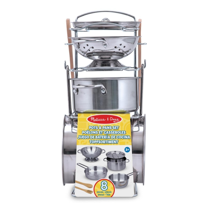 Dette legesæt indeholder skinnende kogegrej i rustfrit stål, som mor og far vil misunde! Sien og de tre pander (med udskifteligt låg) er store nok til at give et mere realistisk indtryk og passer til de fleste legemadvarer til spændende restaurant- og køkkenleg ... og opbevares pænt på et praktisk opbevaringsstativ, når køkkenet er lukket. Alle håndtag og knopper har robuste nittesamlinger, der ikke svækkes og slides som svejsning eller lim. Med to redskaber i hårdt træ og dele i rustfrit stål, der er poleret til en smuk spejlfinish, er dette sæt virkelig fra øverste hylde!