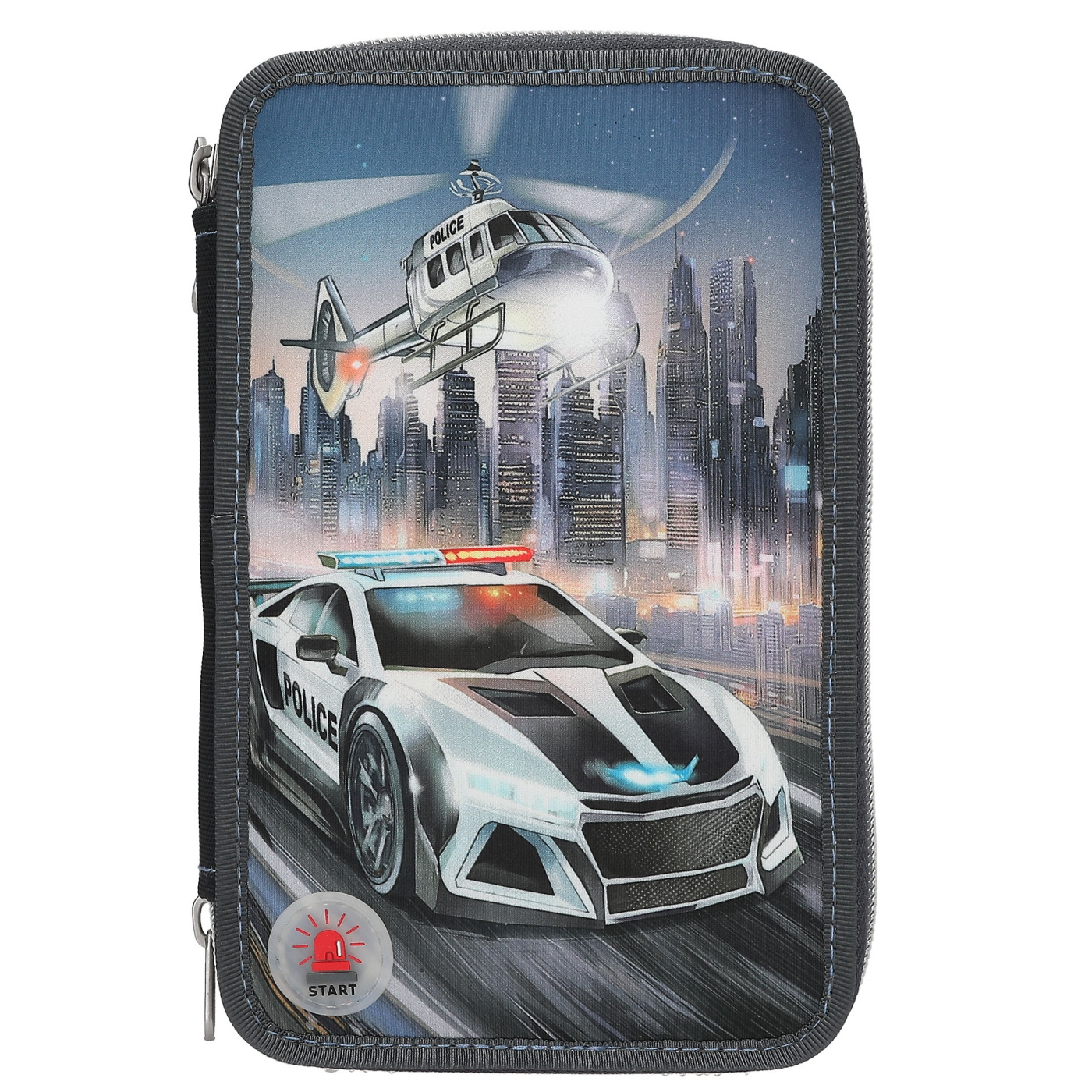 - Iøjnefaldende motiv: Forsiden af dette penalhus viser en dynamisk scene med en politibil og en helikopter, der suser hen over en natlig skyline. Det er et design, der skriger fart og spænding, perfekt til dem, der elsker lidt adrenalin i deres skoledag.