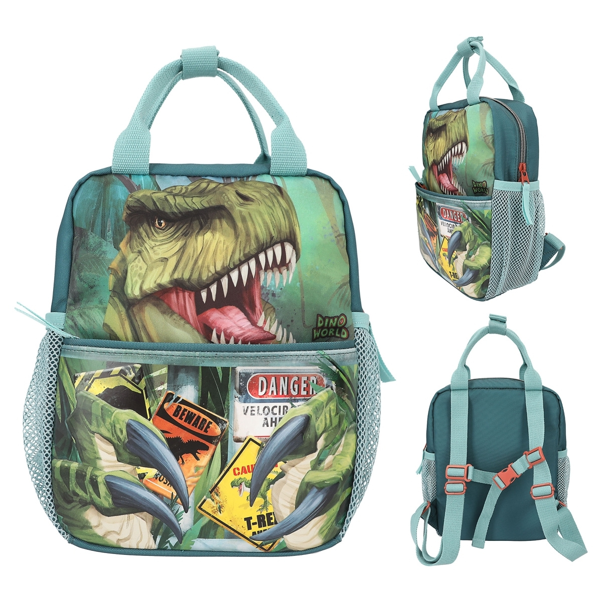 Farligt cool: Den lille rygsæk fra Dino World har et stort T-rex-motiv på forsiden og en påsat forlomme med dinosaurkløer og lyse advarselsskilte i 3D-look. Flotte mørkegrønne nuancer hele vejen rundt, med turkisfarvede stropper, håndtag og netlommer på siden samt rustrøde detaljer. Foret på indersiden er trykt med dinosaurknogler. Materiale: 100 procent polyester